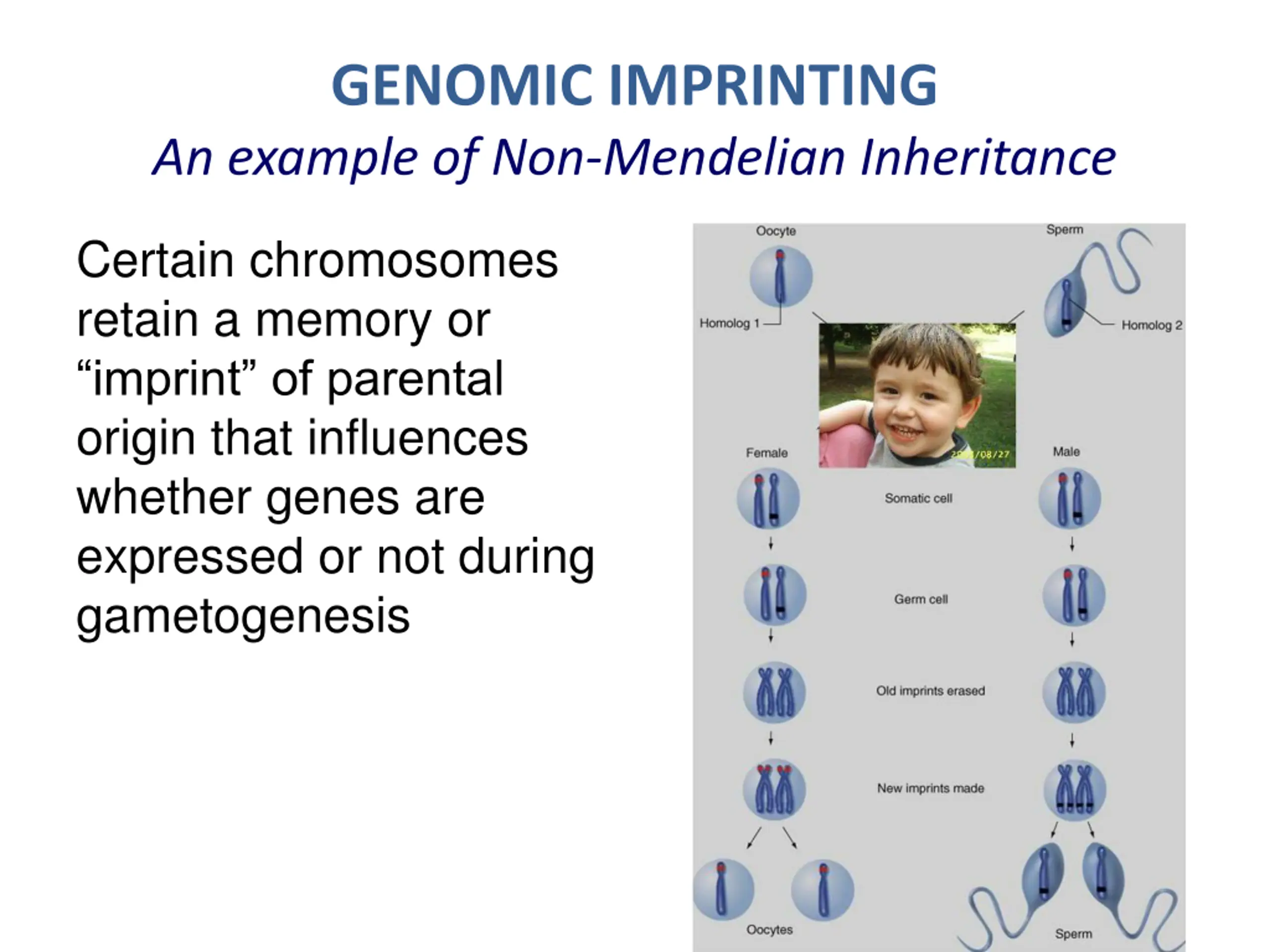 GENOMIC IMPRINTING An example of Non-Mendelian Inheritance Certain chromosomes retain a memory or imprint of parental origin that influences whether genes are expressed or not during gametogenesis