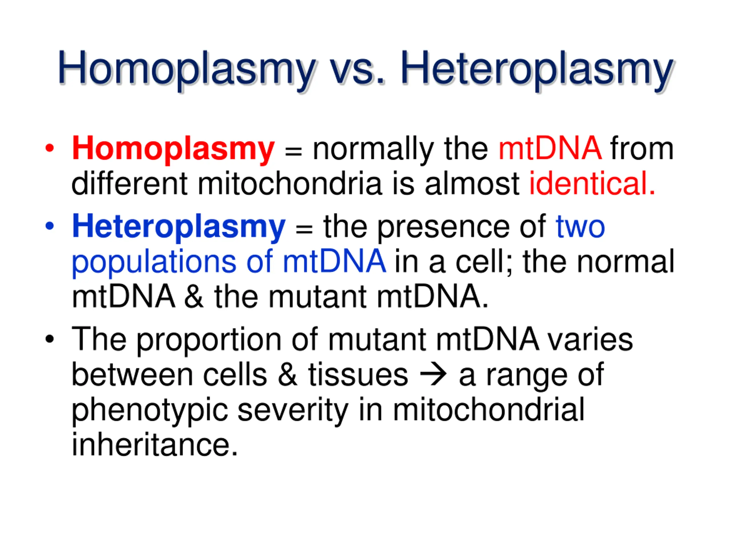 Homoplasmy vs. Heteroplasmy Homoplasmy = normally the mtDNA from different mitochondria is almost identical. Heteroplasmy = the presence of two populations of mtDNA in a cell; the normal mtDNA & the mutant mtDNA. The proportion of mutant mtDNA varies between cells & tissues a range of phenotypic severity in mitochondrial inheritance.