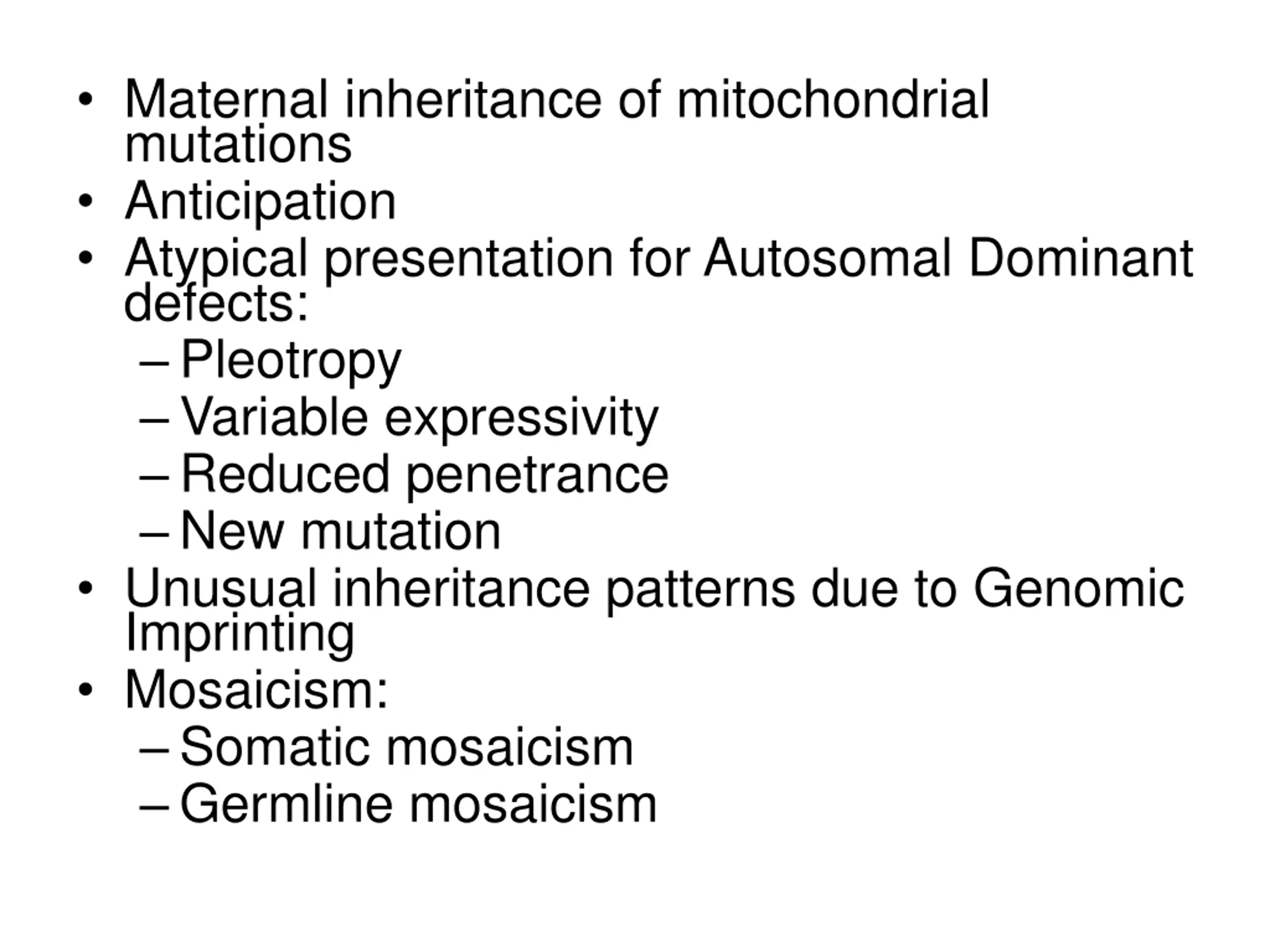 Maternal inheritance of mitochondrial mutations Anticipation Atypical presentation for Autosomal Dominant defects: Pleotropy Variable expressivity Reduced penetrance New mutation Unusual inheritance patterns due to Genomic Imprinting Mosaicism: Somatic mosaicism Germline mosaicism