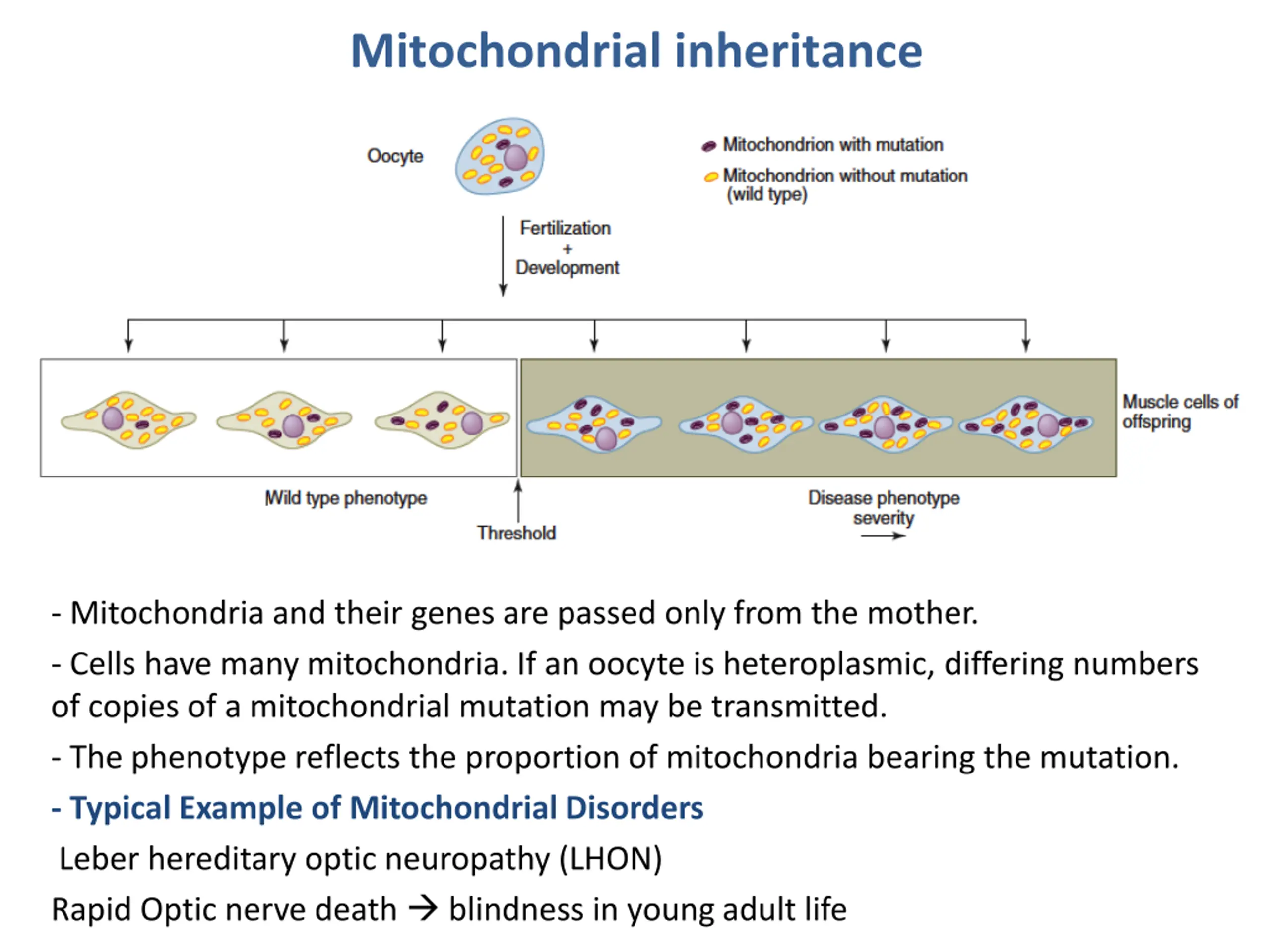 Mitochondrial inheritance - Mitochondria and their genes are passed only from the mother. - Cells have many mitochondria. If an oocyte is heteroplasmic, differing numbers of copies of a mitochondrial mutation may be transmitted. - The phenotype reflects the proportion of mitochondria bearing the mutation. - Typical Example of Mitochondrial Disorders Leber hereditary optic neuropathy (LHON) Rapid Optic nerve death blindness in young adult life