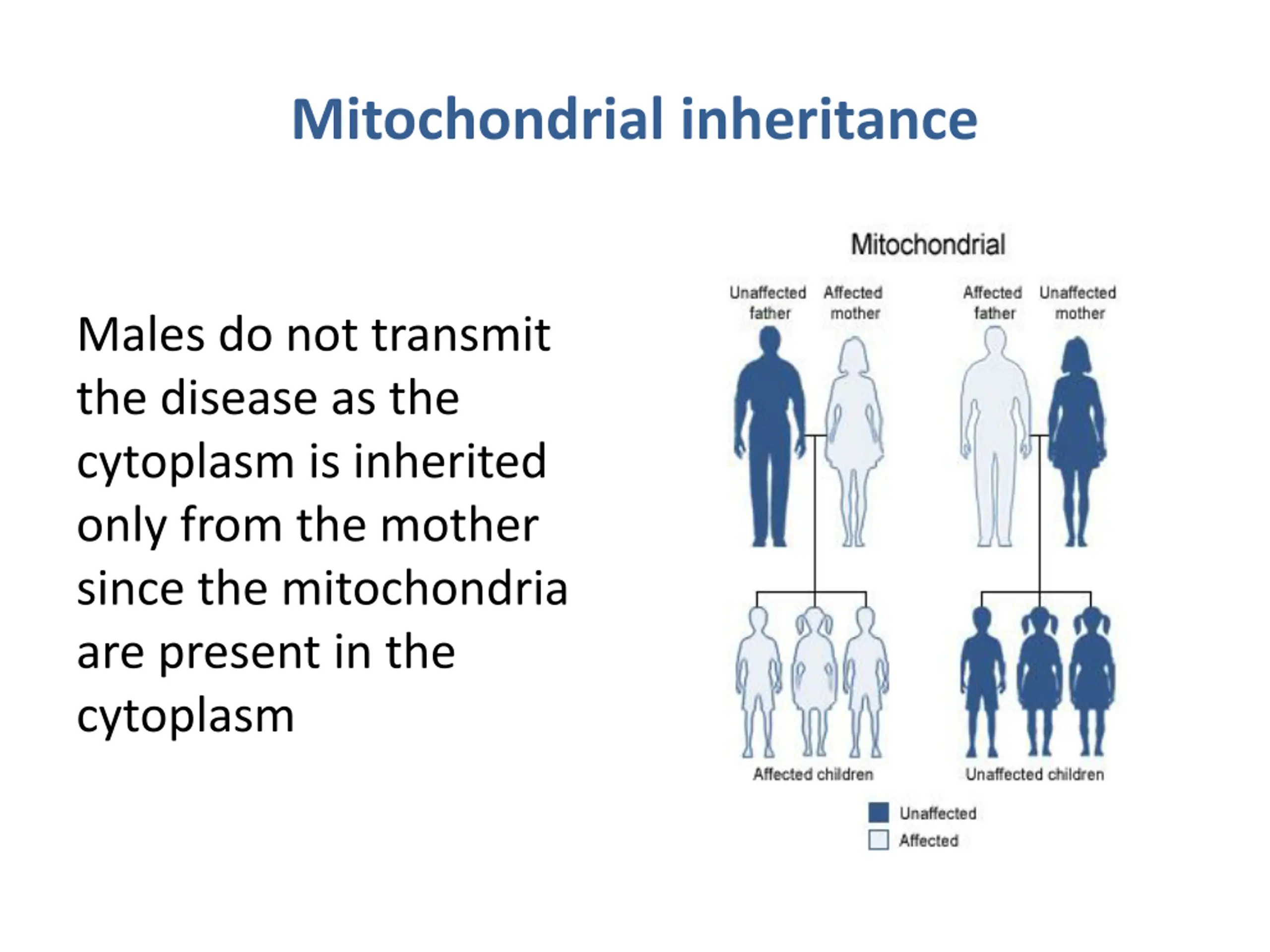 Mitochondrial inheritance Males do not transmit the disease as the cytoplasm is inherited only from the mother since the mitochondria are present in the cytoplasm