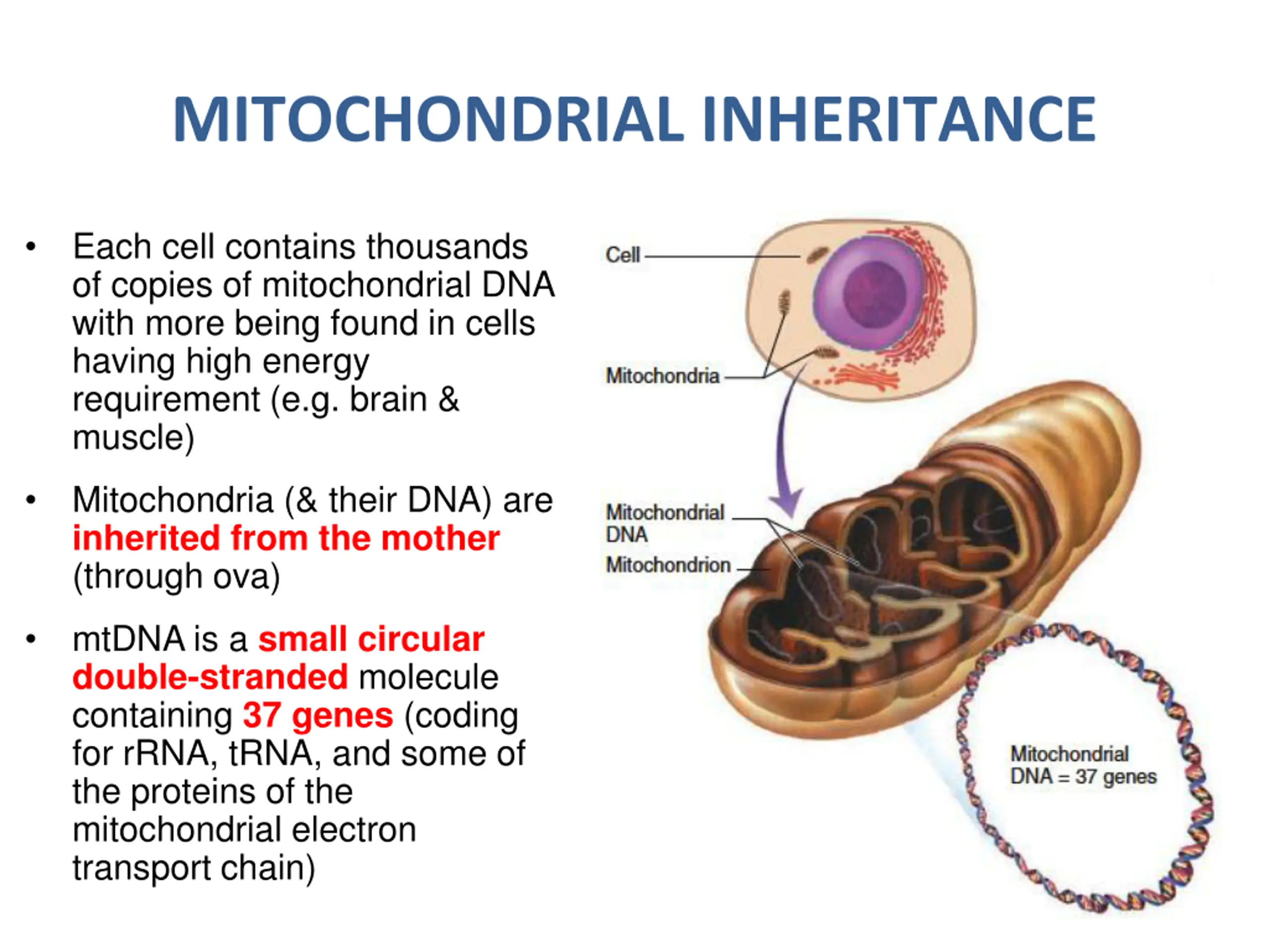 MITOCHONDRIAL INHERITANCE Each cell contains thousands of copies of mitochondrial DNA with more being found in cells having high energy requirement (e.g. brain & muscle) Mitochondria (& their DNA) are inherited from the mother (through ova) mtDNA is a small circular double-stranded molecule containing 37 genes (coding for rRNA, tRNA, and some of the proteins of the mitochondrial electron transport chain)