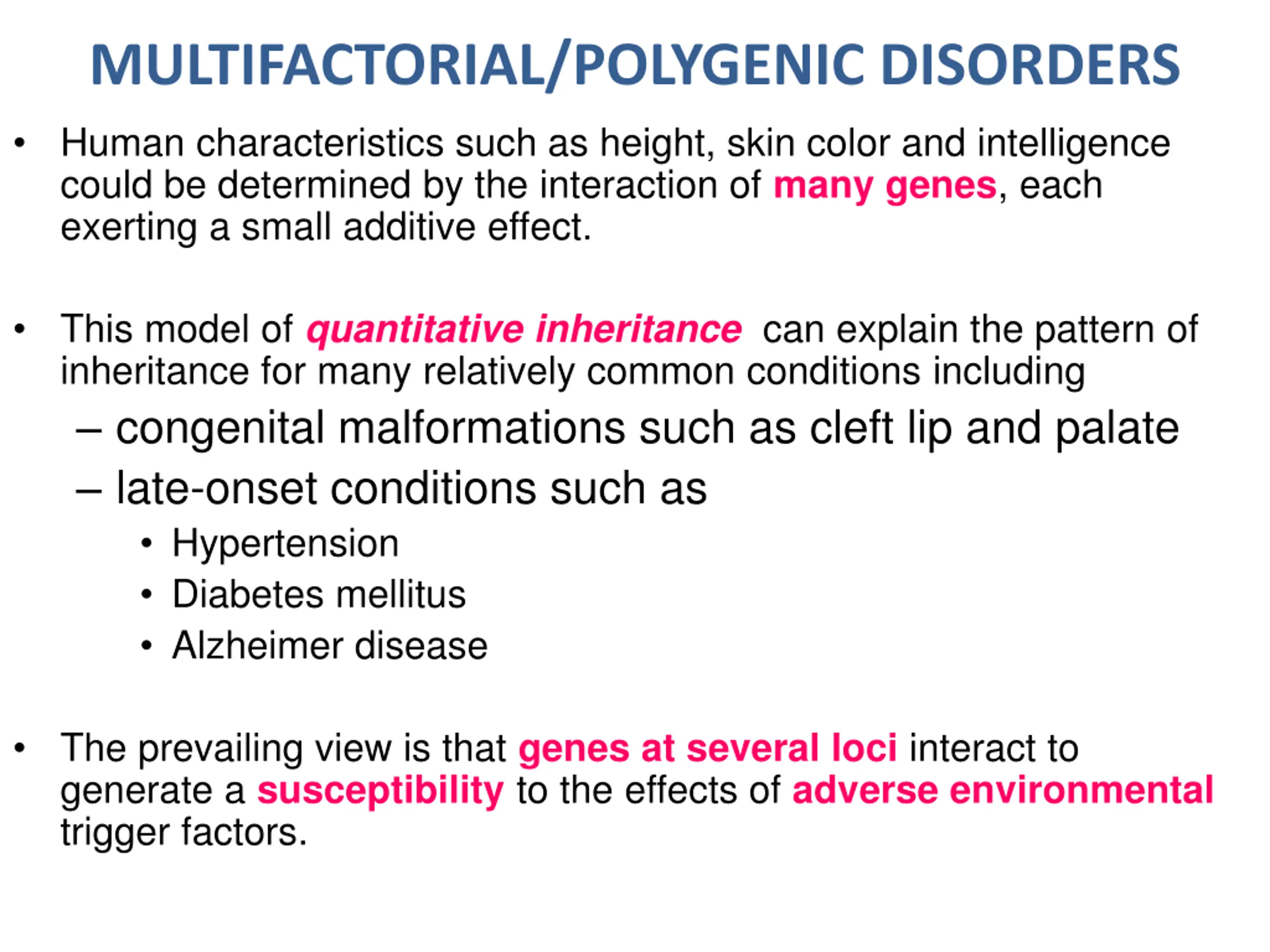 MULTIFACTORIAL/POLYGENIC DISORDERS Human characteristics such as height, skin color and intelligence could be determined by the interaction of many genes, each exerting a small additive effect. This model of quantitative inheritance can explain the pattern of inheritance for many relatively common conditions including congenital malformations such as cleft lip and palate late-onset conditions such as Hypertension Diabetes mellitus Alzheimer disease The prevailing view is that genes at several loci interact to generate a susceptibility to the effects of adverse environmental trigger factors.