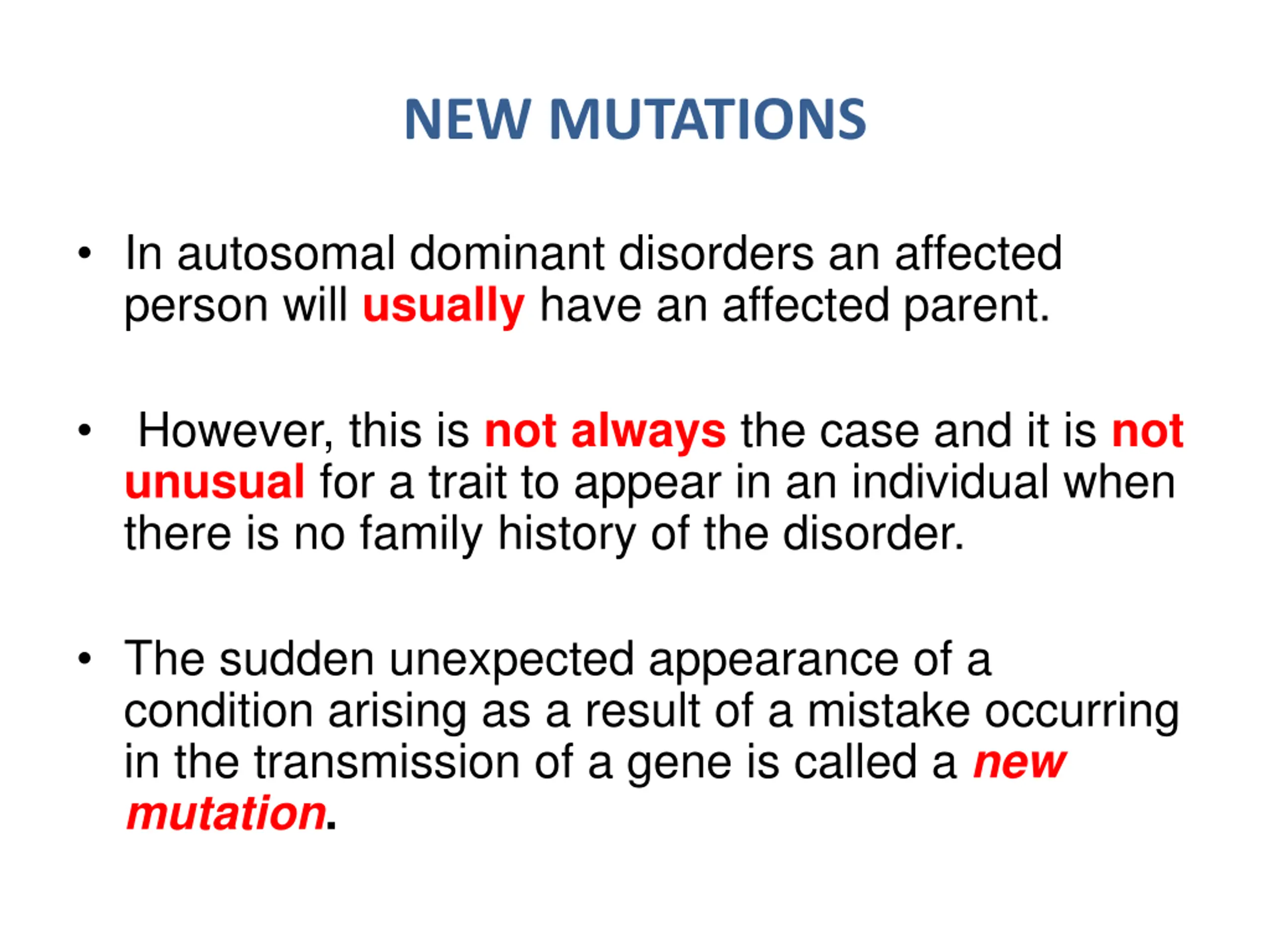 NEW MUTATIONS In autosomal dominant disorders an affected person will usually have an affected parent. However, this is not always the case and it is not unusual for a trait to appear in an individual when there is no family history of the disorder. The sudden unexpected appearance of a condition arising as a result of a mistake occurring in the transmission of a gene is called a new mutation.