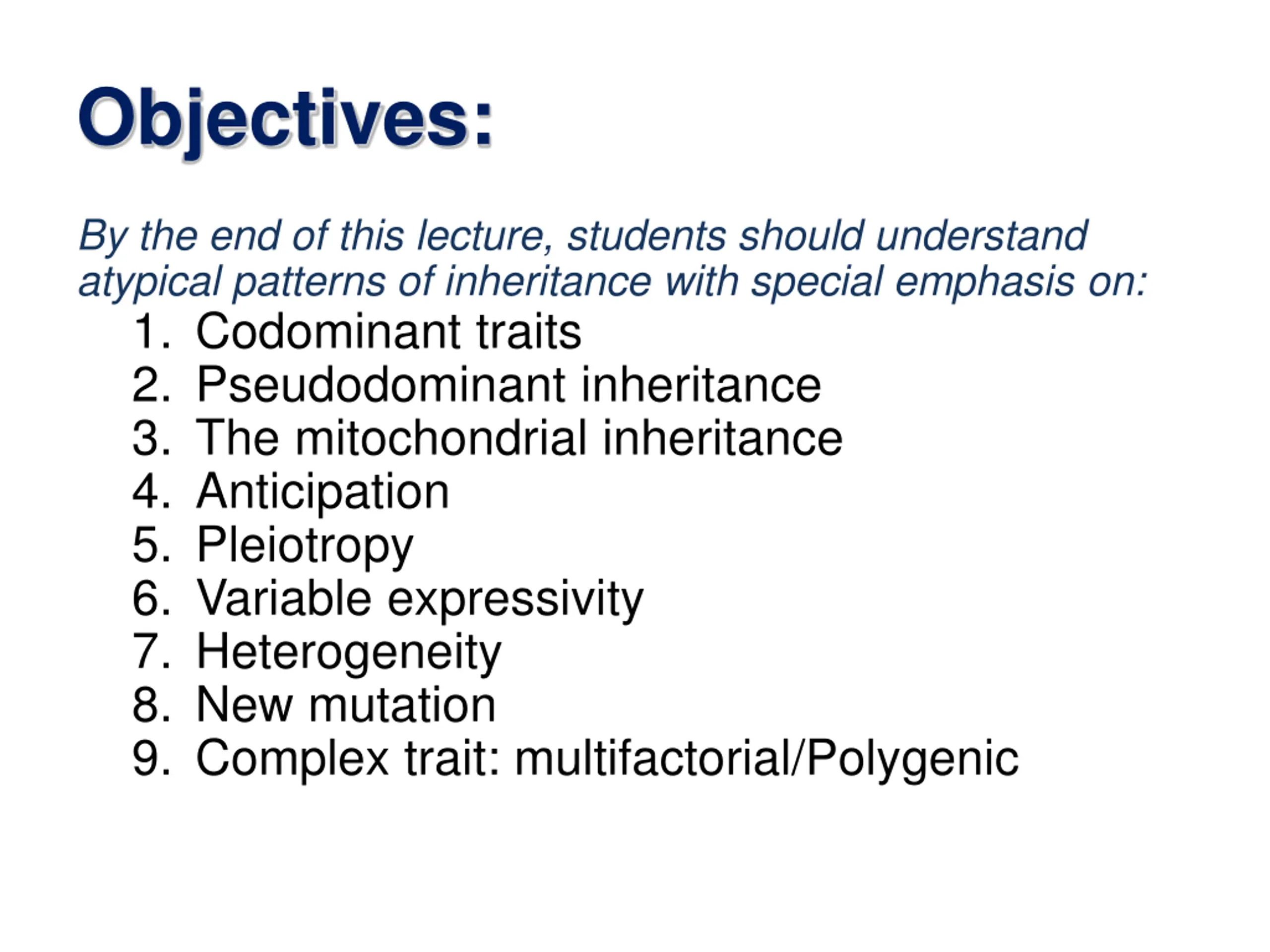 Objectives: By the end of this lecture, students should understand atypical patterns of inheritance with special emphasis on: 1. Codominant traits 2. Pseudodominant inheritance 3. The mitochondrial inheritance 4. Anticipation 5. Pleiotropy 6. Variable expressivity 7. Heterogeneity 8. New mutation 9. Complex trait: multifactorial/Polygenic