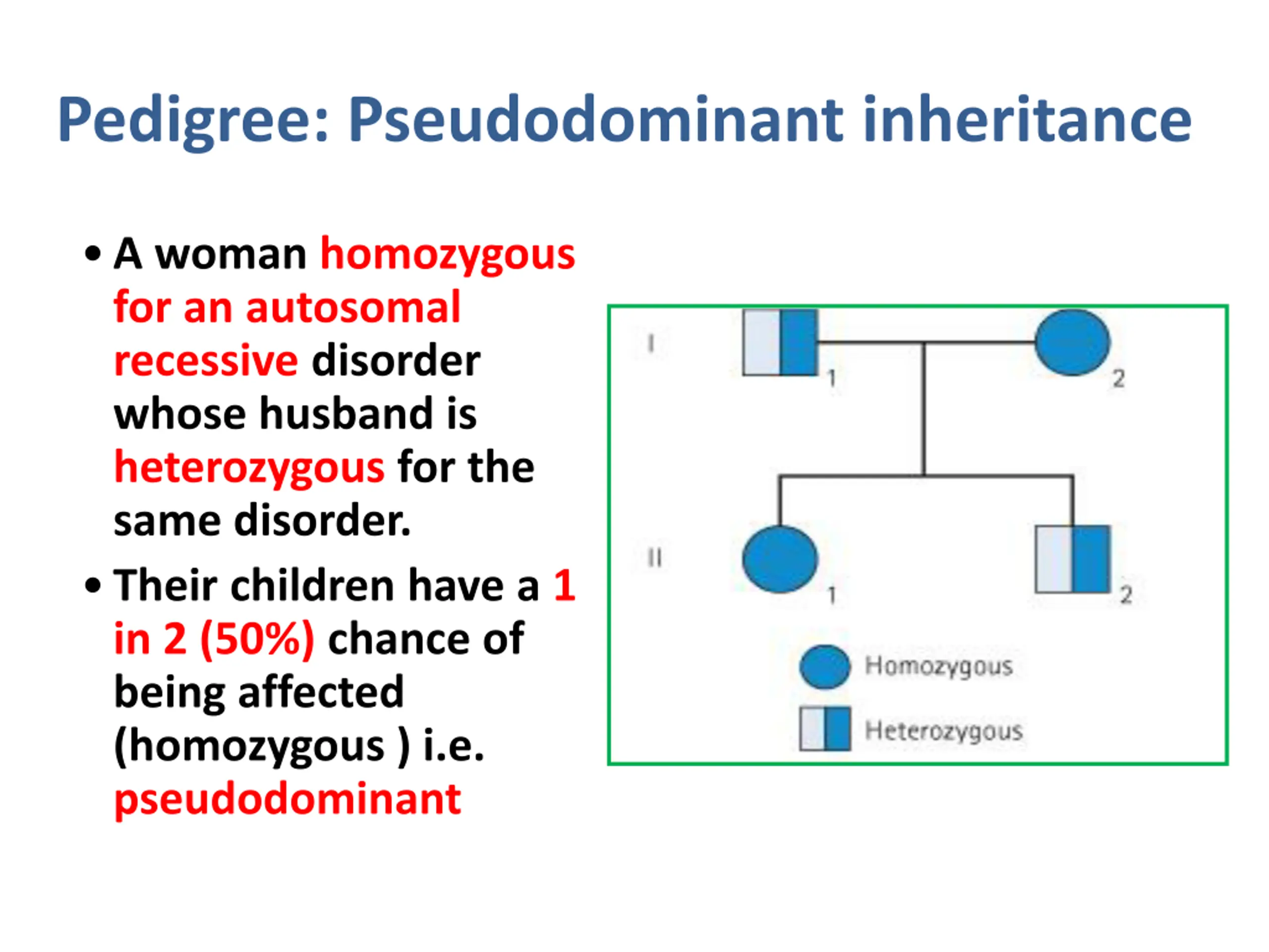 Pedigree: Pseudodominant inheritance A woman homozygous for an autosomal recessive disorder whose husband is heterozygous for the same disorder. Their children have a 1 in 2 (50%) chance of being affected (homozygous ) i.e. pseudodominant