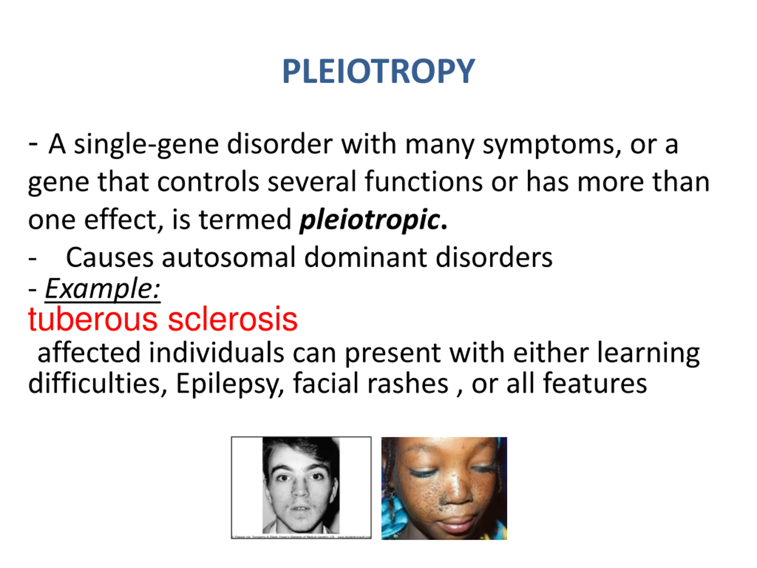 PLEIOTROPY - A single-gene disorder with many symptoms, or a gene that controls several functions or has more than one effect, is termed pleiotropic. - Causes autosomal dominant disorders - Example: tuberous sclerosis affected individuals can present with either learning difficulties, Epilepsy, facial rashes , or all features