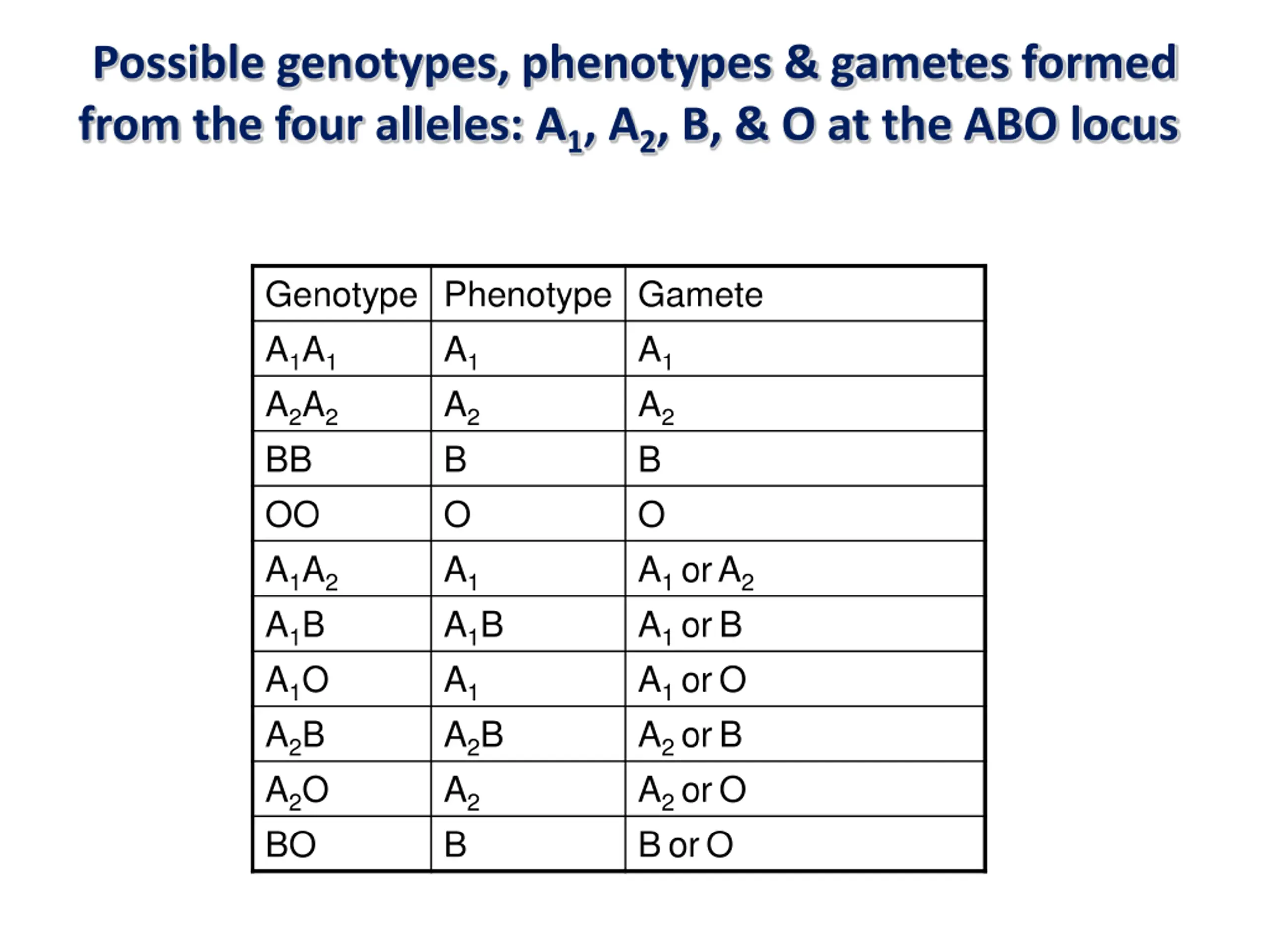 Possible genotypes, phenotypes & gametes formed from the four alleles: A1, A2, B, & O at the ABO locus Genotype A1A1 A2A2 BB OO A1A2 A1B A1O A2B A2O BO Phenotype A1 A2 B O A1 A1B A1 A2B A2 B Gamete A1 A2 B O A1 orA2 A1 orB A1 orO A2 orB A2 orO BorO