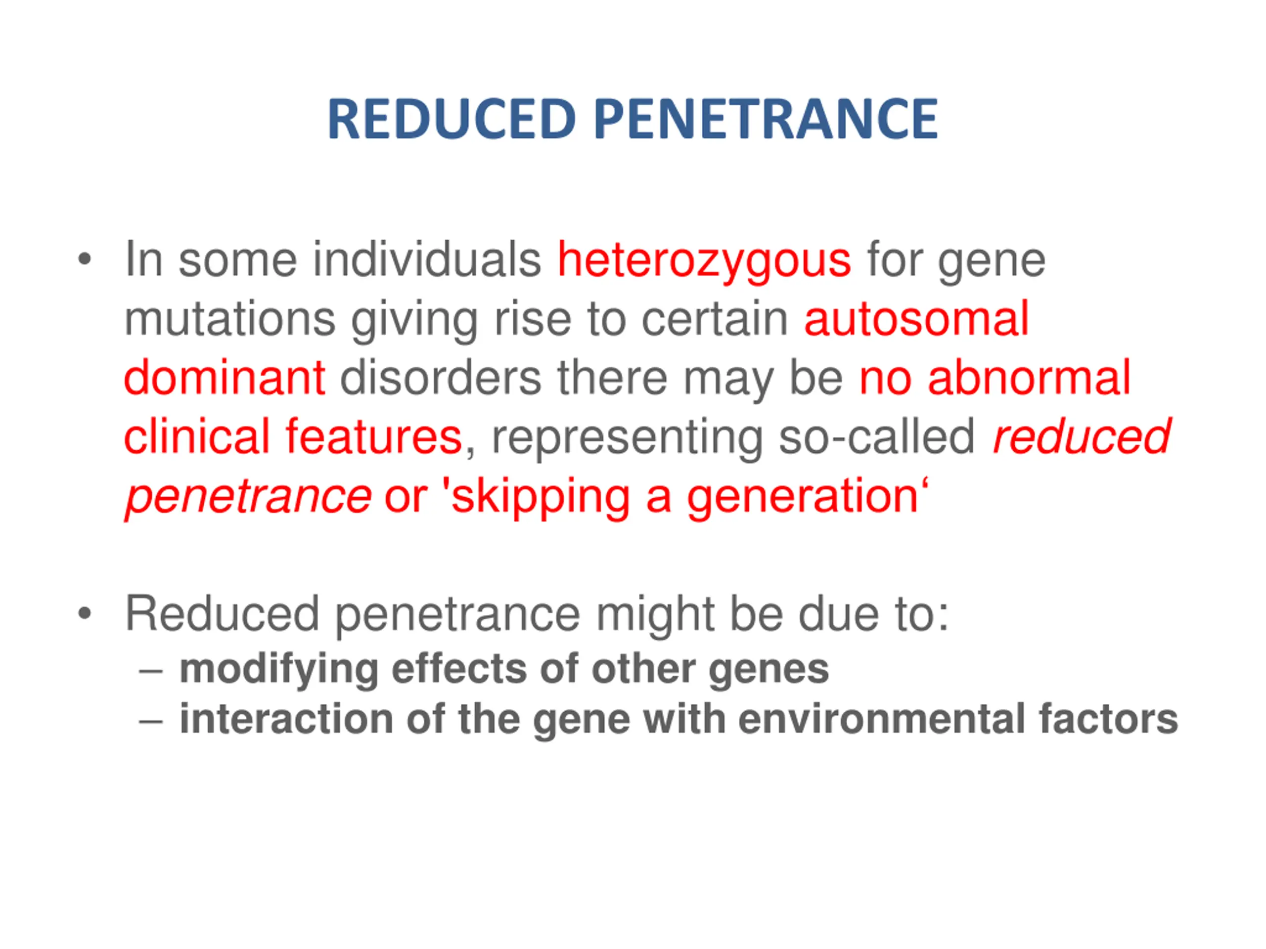 REDUCED PENETRANCE In some individuals heterozygous for gene mutations giving rise to certain autosomal dominant disorders there may be no abnormal clinical features, representing so-called reduced penetrance or 'skipping a generation Reduced penetrance might be due to: modifying effects of other genes interaction of the gene with environmental factors
