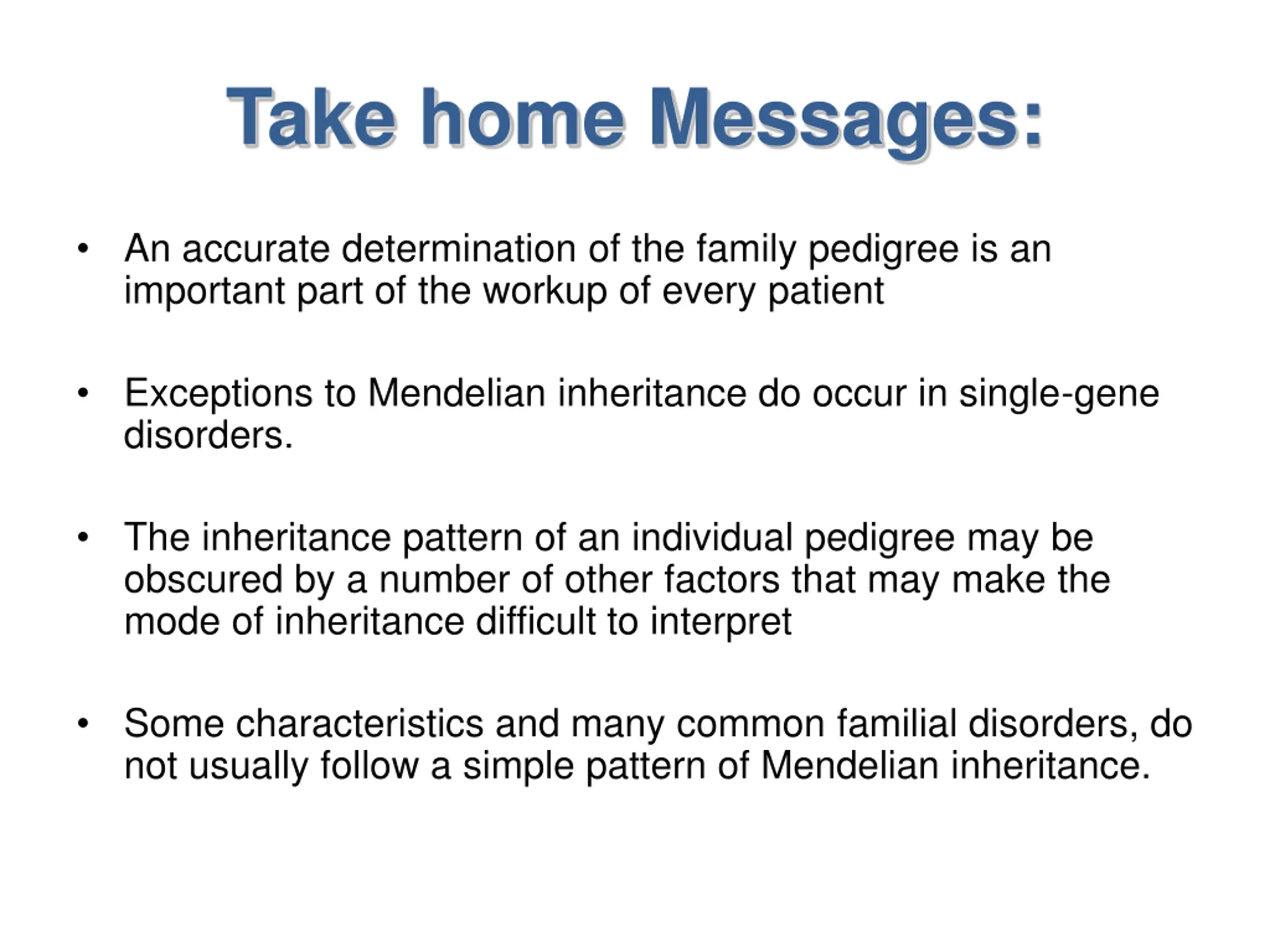 Take home Messages: An accurate determination of the family pedigree is an important part of the workup of every patient Exceptions to Mendelian inheritance do occur in single-gene disorders. The inheritance pattern of an individual pedigree may be obscured by a number of other factors that may make the mode of inheritance difficult to interpret Some characteristics and many common familial disorders, do not usually follow a simple pattern of Mendelian inheritance.