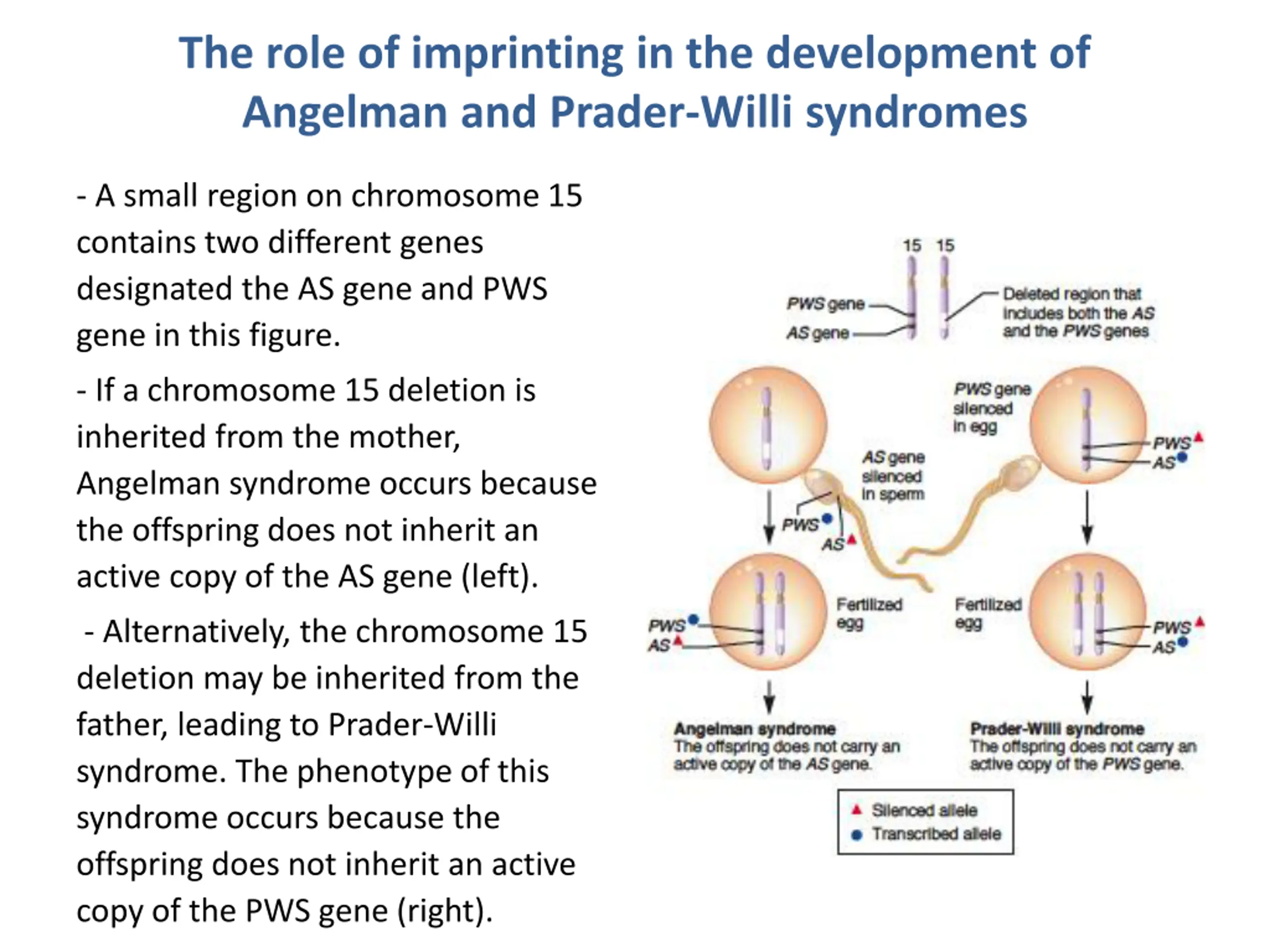 The role of imprinting in the development of Angelman and Prader-Willi syndromes - A small region on chromosome 15 contains two different genes designated the AS gene and PWS gene in this figure. - If a chromosome 15 deletion is inherited from the mother, Angelman syndrome occurs because the offspring does not inherit an active copy of the AS gene (left). - Alternatively, the chromosome 15 deletion may be inherited from the father, leading to Prader-Willi syndrome. The phenotype of this syndrome occurs because the offspring does not inherit an active copy of the PWS gene (right).
