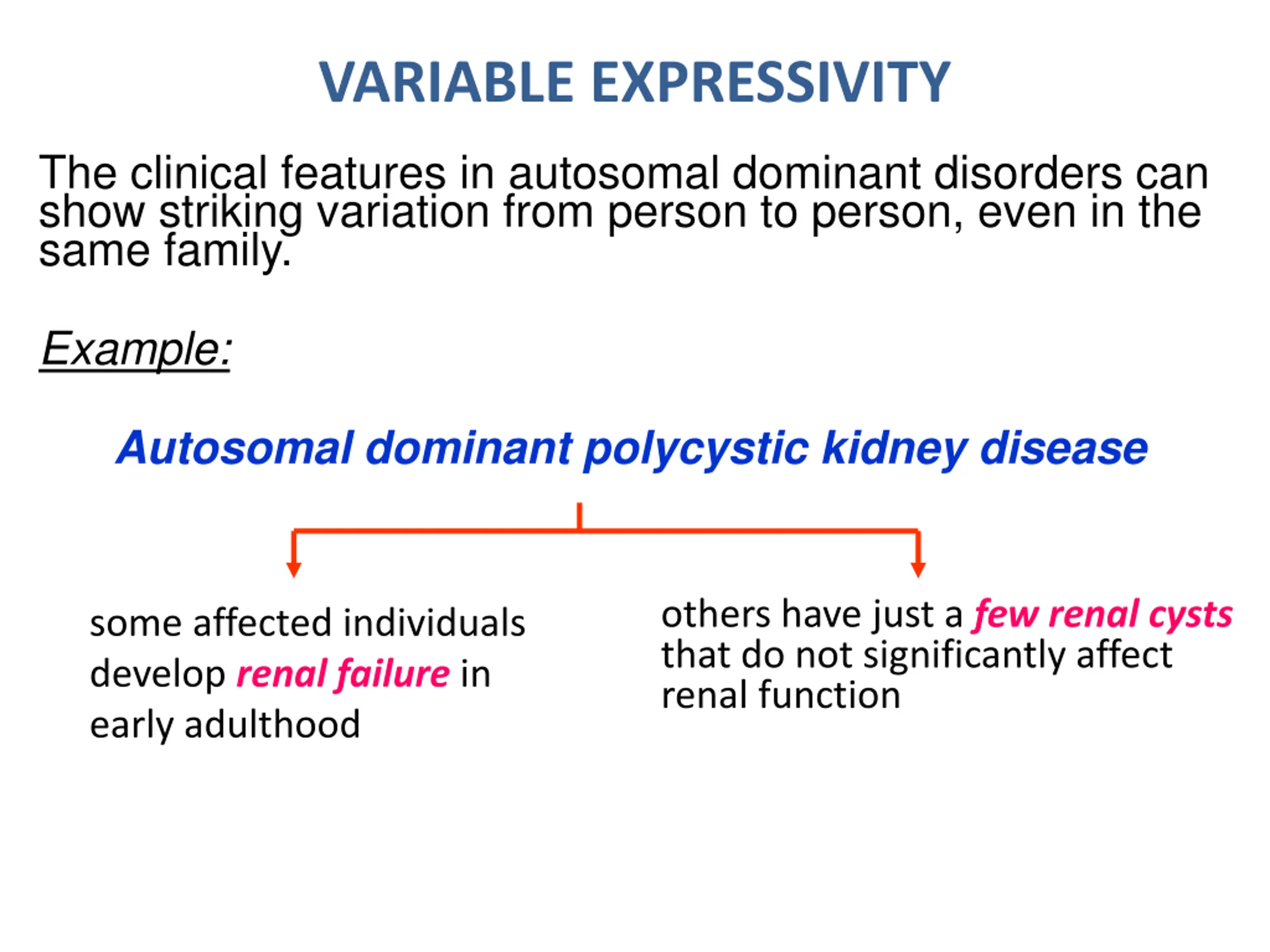 VARIABLE EXPRESSIVITY The clinical features in autosomal dominant disorders can show striking variation from person to person, even in the same family. Example: Autosomal dominant polycystic kidney disease others have just a few renal cysts that do not significantly affect renal function some affected individuals develop renal failure in early adulthood
