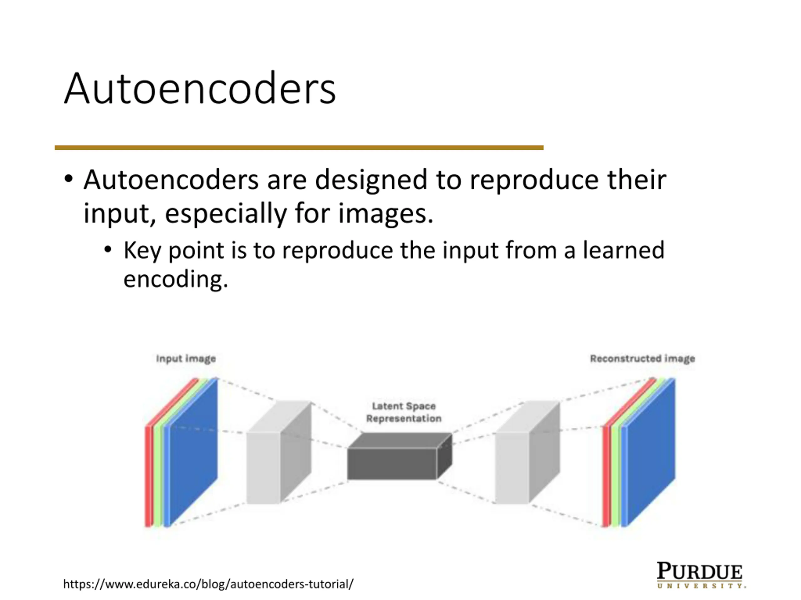 Autoencoders Autoencoders are designed to reproduce their input, especially for images. Key point is to reproduce the input from a learned encoding. https://www.edureka.co/blog/autoencoders-tutorial/