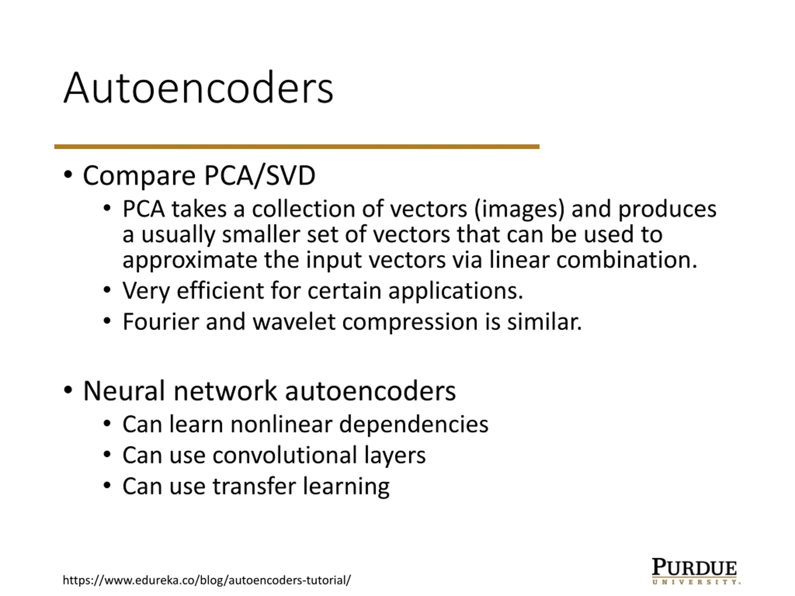 Autoencoders Compare PCA/SVD PCA takes a collection of vectors (images) and produces a usually smaller set of vectors that can be used to approximate the input vectors via linear combination. Very efficient for certain applications. Fourier and wavelet compression is similar. Neural network autoencoders Can learn nonlinear dependencies Can use convolutional layers Can use transfer learning https://www.edureka.co/blog/autoencoders-tutorial/