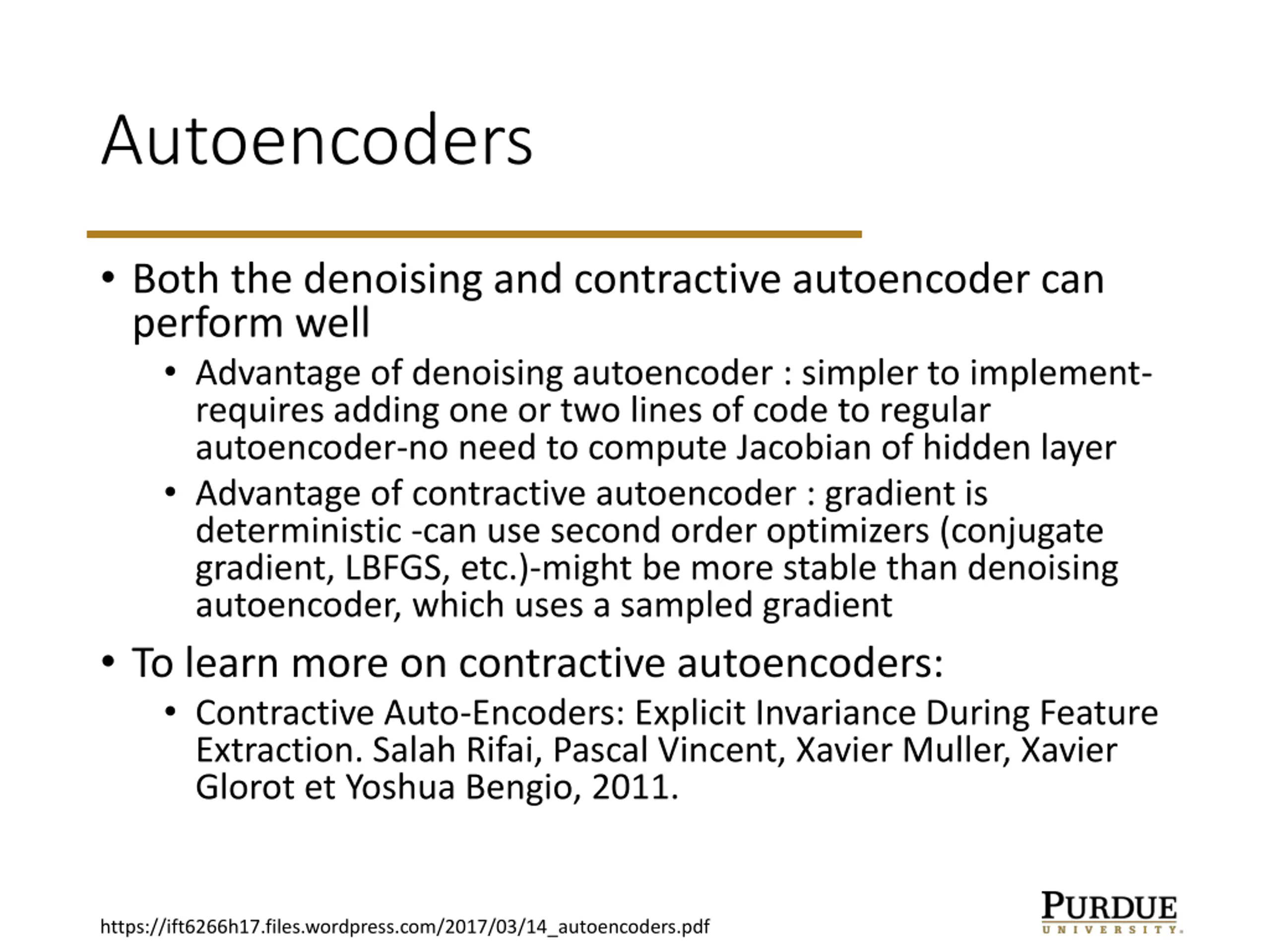 Autoencoders Both the denoising and contractive autoencoder can perform well Advantage of denoising autoencoder : simpler to implement- requires adding one or two lines of code to regular autoencoder-no need to compute Jacobian of hidden layer Advantage of contractive autoencoder : gradient is deterministic -can use second order optimizers (conjugate gradient, LBFGS, etc.)-might be more stable than denoising autoencoder, which uses a sampled gradient To learn more on contractive autoencoders: Contractive Auto-Encoders: Explicit Invariance During Feature Extraction. Salah Rifai, Pascal Vincent, Xavier Muller, Xavier Glorot et Yoshua Bengio, 2011. https://ift6266h17.files.wordpress.com/2017/03/14_autoencoders.pdf