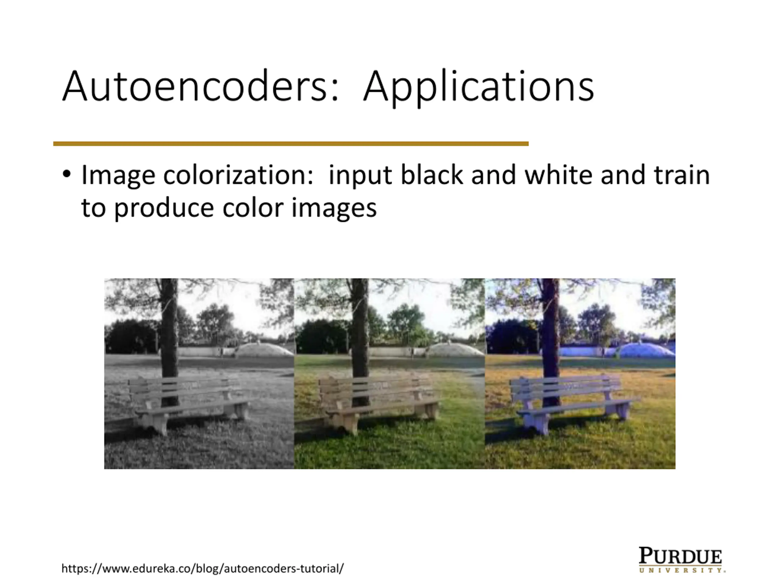 Autoencoders: Applications Image colorization: input black and white and train to produce color images https://www.edureka.co/blog/autoencoders-tutorial/