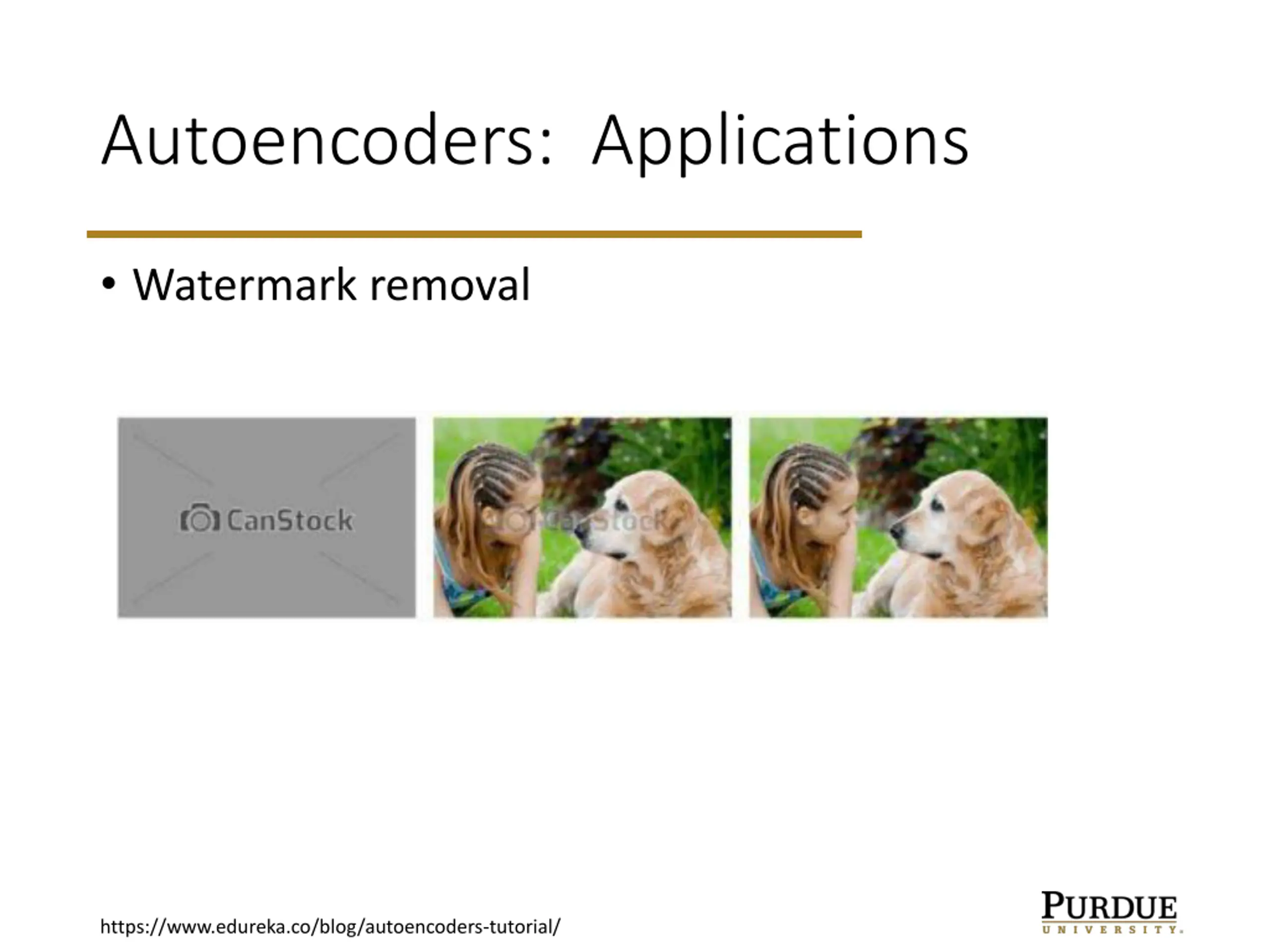 Autoencoders: Applications Watermark removal https://www.edureka.co/blog/autoencoders-tutorial/