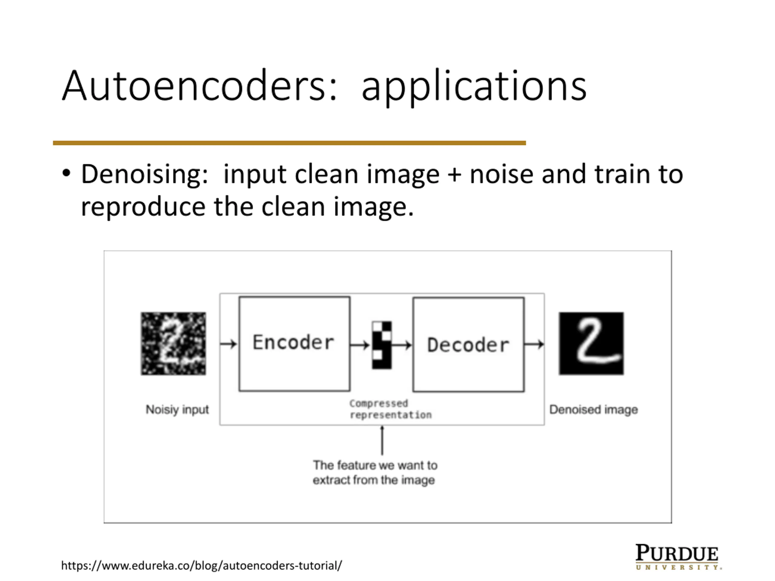 Autoencoders: applications Denoising: input clean image + noise and train to reproduce the clean image. https://www.edureka.co/blog/autoencoders-tutorial/