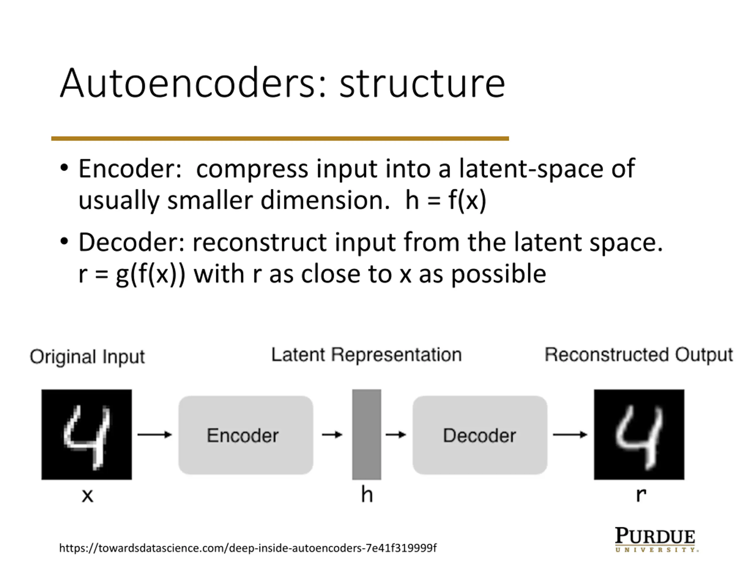 Autoencoders: structure Encoder: compress input into a latent-space of usually smaller dimension. h = f(x) Decoder: reconstruct input from the latent space. r = g(f(x)) with r as close to x as possible https://towardsdatascience.com/deep-inside-autoencoders-7e41f319999f