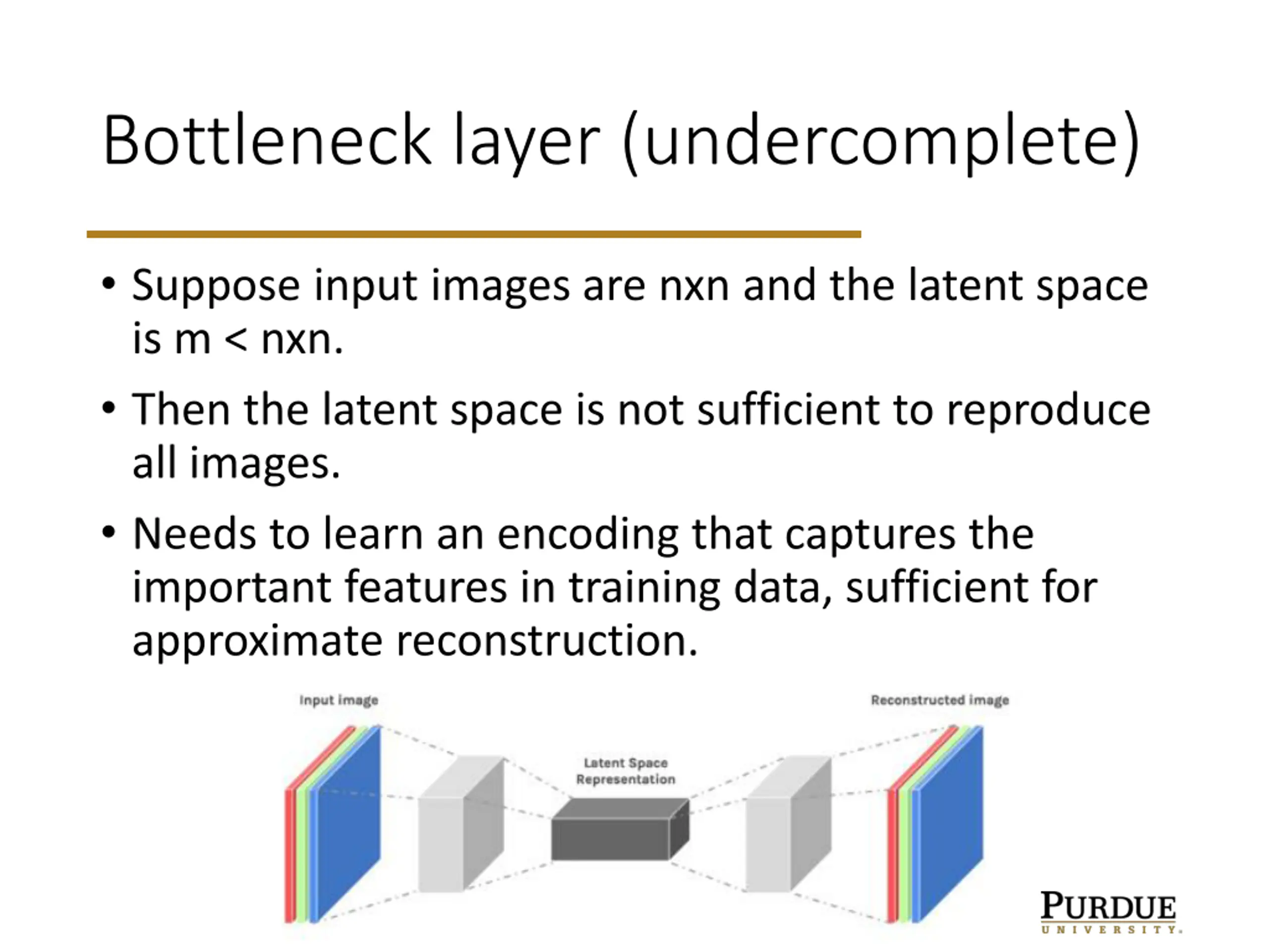 Bottleneck layer (undercomplete) Suppose input images are nxn and the latent space is m < nxn. Then the latent space is not sufficient to reproduce all images. Needs to learn an encoding that captures the important features in training data, sufficient for approximate reconstruction.