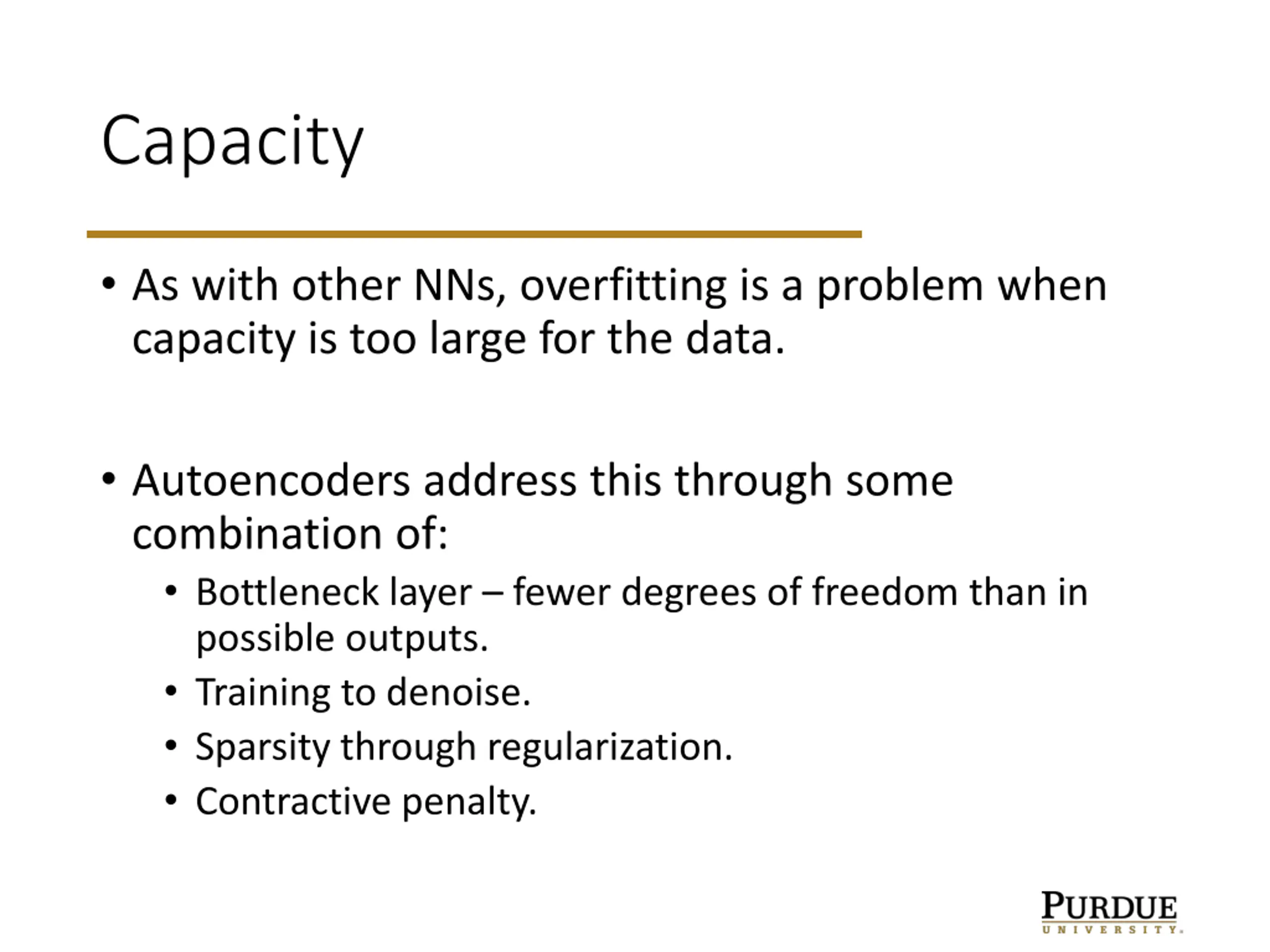 Capacity As with other NNs, overfitting is a problem when capacity is too large for the data. Autoencoders address this through some combination of: Bottleneck layer fewer degrees of freedom than in possible outputs. Training to denoise. Sparsity through regularization. Contractive penalty.