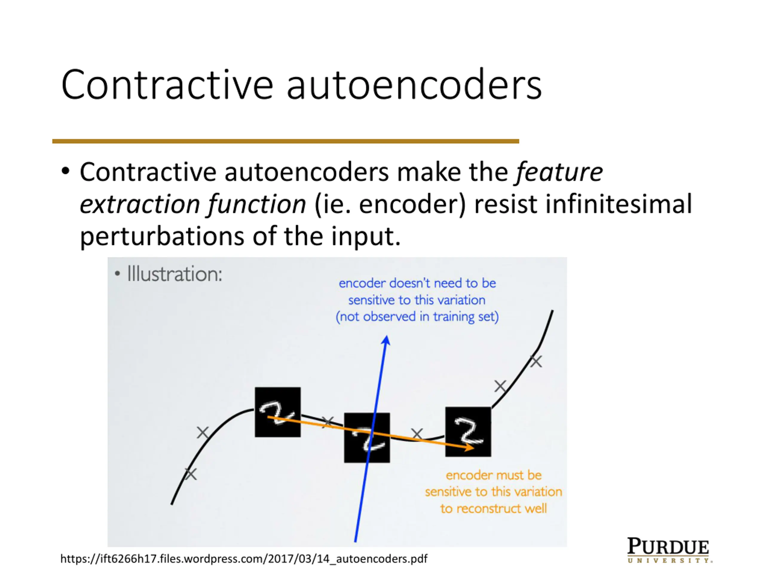 Contractive autoencoders Contractive autoencoders make the feature extraction function (ie. encoder) resist infinitesimal perturbations of the input. https://ift6266h17.files.wordpress.com/2017/03/14_autoencoders.pdf