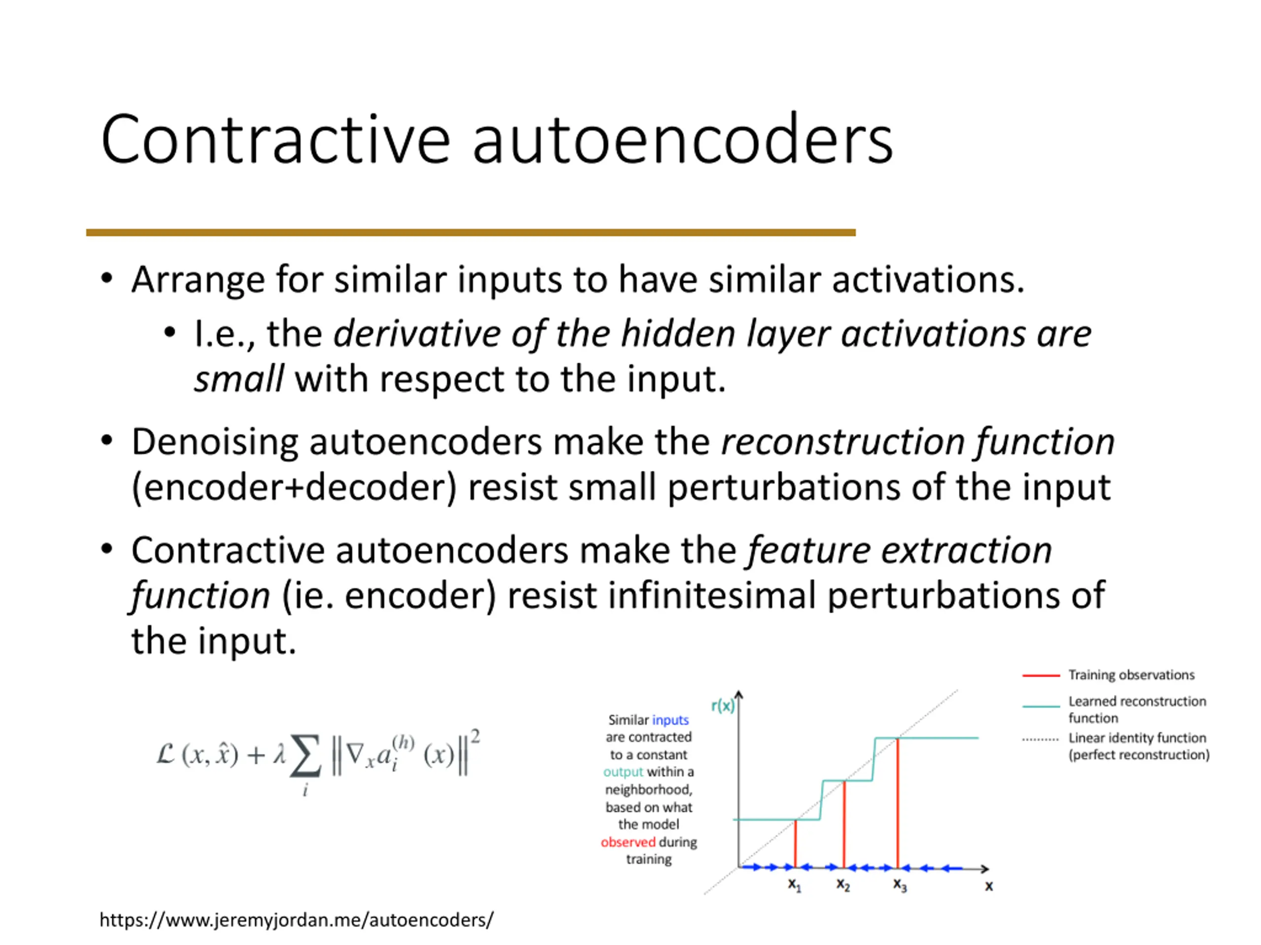 Contractive autoencoders Arrange for similar inputs to have similar activations. I.e., the derivative of the hidden layer activations are small with respect to the input. Denoising autoencoders make the reconstruction function (encoder+decoder) resist small perturbations of the input Contractive autoencoders make the feature extraction function (ie. encoder) resist infinitesimal perturbations of the input. https://www.jeremyjordan.me/autoencoders/