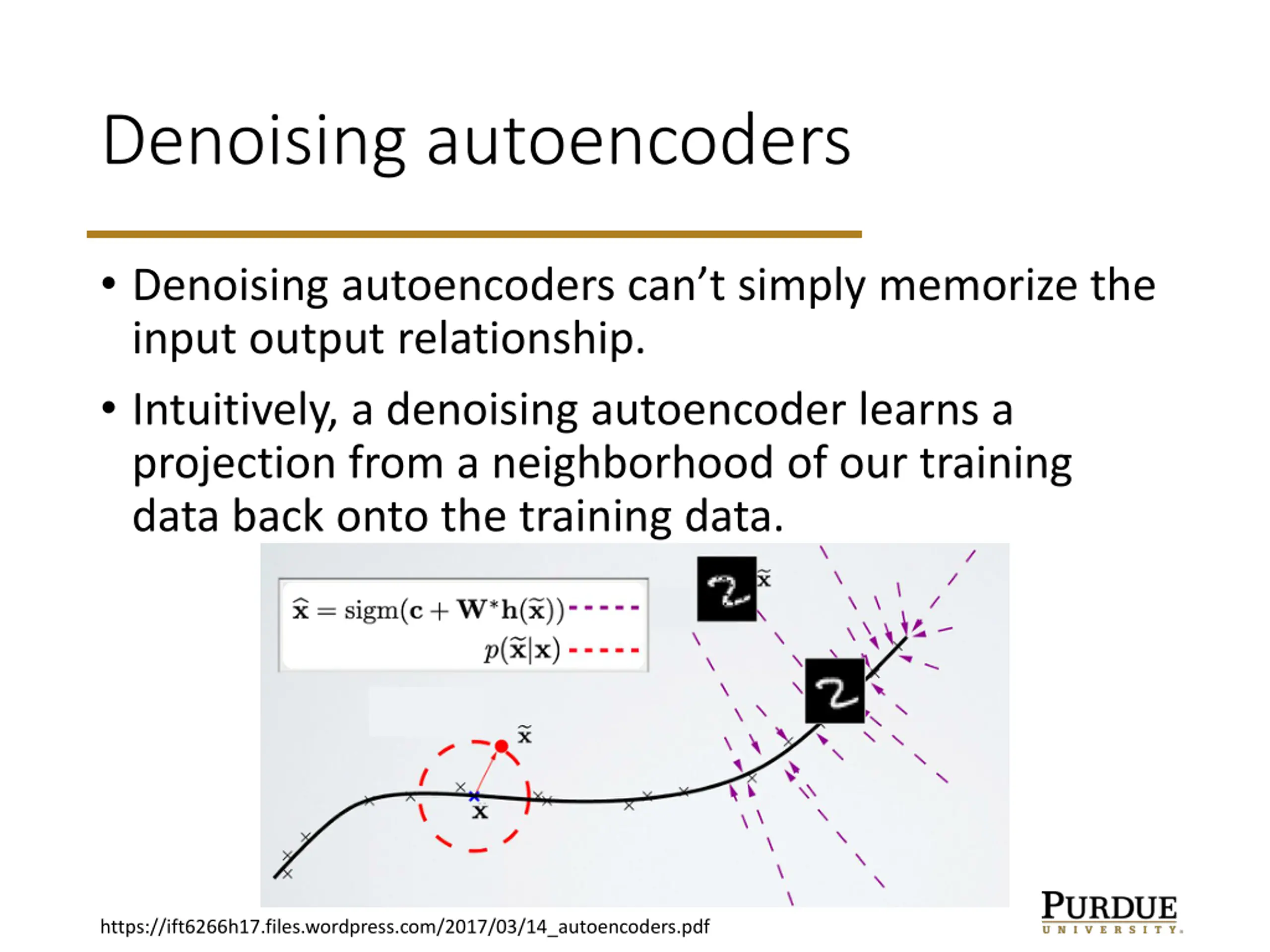 Denoising autoencoders Denoising autoencoders can t simply memorize the input output relationship. Intuitively, a denoising autoencoder learns a projection from a neighborhood of our training data back onto the training data. https://ift6266h17.files.wordpress.com/2017/03/14_autoencoders.pdf