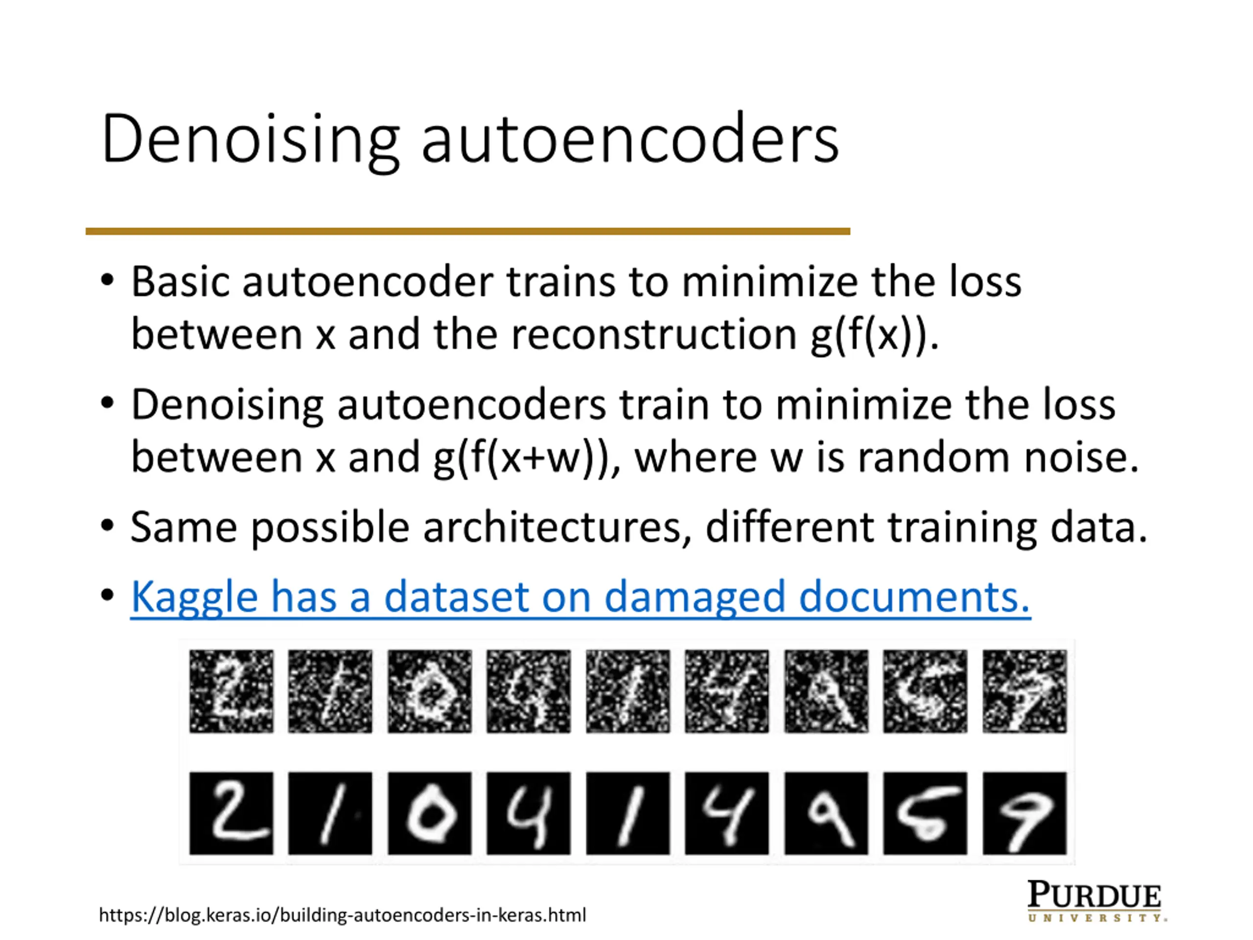 Denoising autoencoders Basic autoencoder trains to minimize the loss between x and the reconstruction g(f(x)). Denoising autoencoders train to minimize the loss between x and g(f(x+w)), where w is random noise. Same possible architectures, different training data. Kaggle has a dataset on damaged documents. https://blog.keras.io/building-autoencoders-in-keras.html