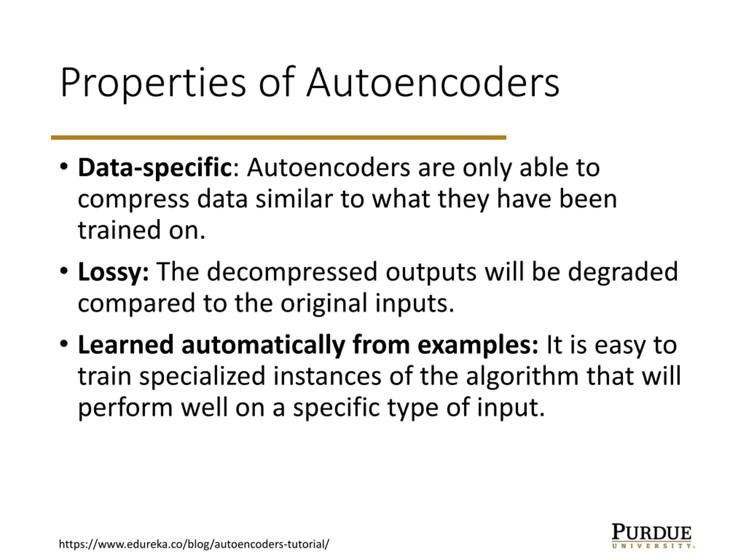 Properties of Autoencoders Data-specific: Autoencoders are only able to compress data similar to what they have been trained on. Lossy: The decompressed outputs will be degraded compared to the original inputs. Learned automatically from examples: It is easy to train specialized instances of the algorithm that will perform well on a specific type of input. https://www.edureka.co/blog/autoencoders-tutorial/