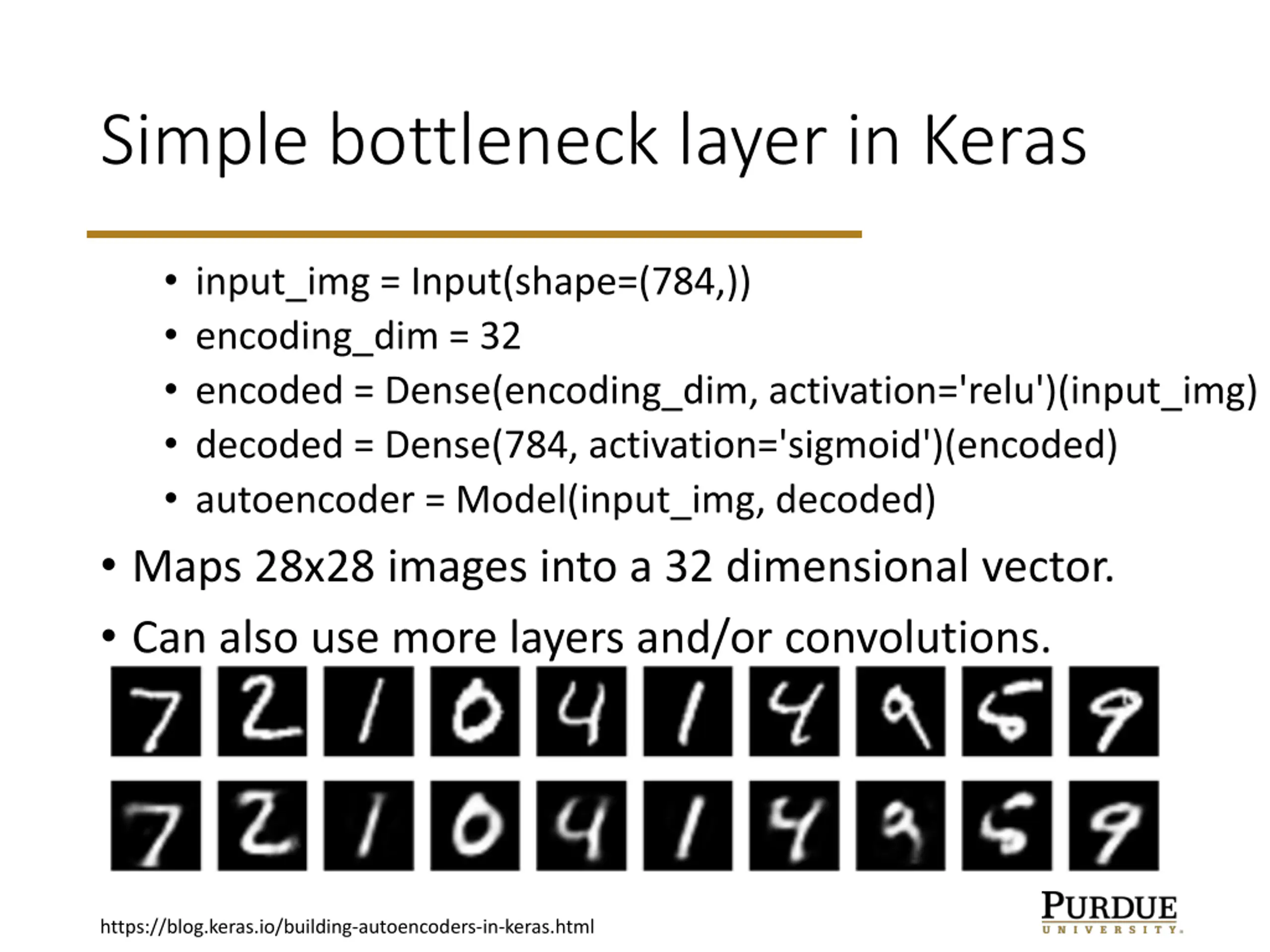 Simple bottleneck layer in Keras input_img = Input(shape=(784,)) encoding_dim = 32 encoded = Dense(encoding_dim, activation='relu')(input_img) decoded = Dense(784, activation='sigmoid')(encoded) autoencoder = Model(input_img, decoded) Maps 28x28 images into a 32 dimensional vector. Can also use more layers and/or convolutions. https://blog.keras.io/building-autoencoders-in-keras.html