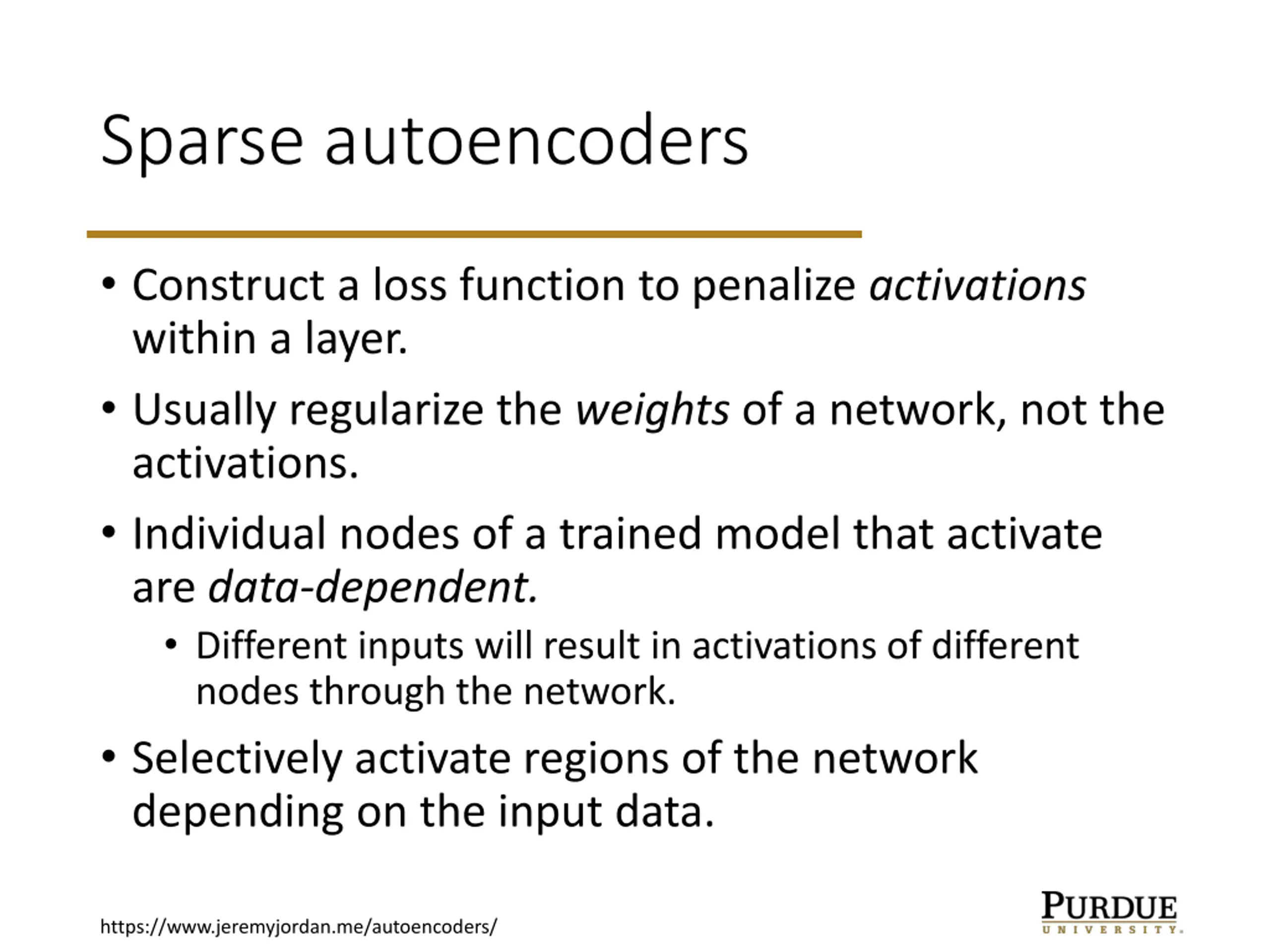 Sparse autoencoders Construct a loss function to penalize activations within a layer. Usually regularize the weights of a network, not the activations. Individual nodes of a trained model that activate are data-dependent. Different inputs will result in activations of different nodes through the network. Selectively activate regions of the network depending on the input data. https://www.jeremyjordan.me/autoencoders/