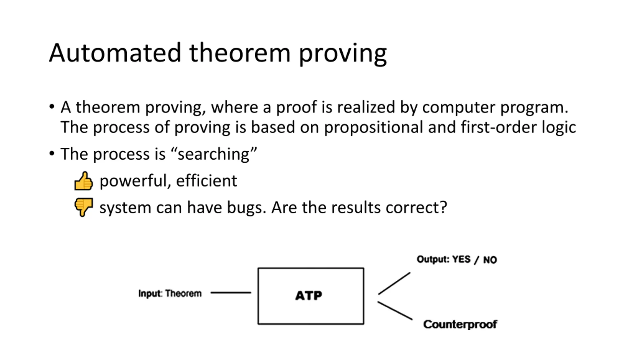 Automated theorem proving A theorem proving, where a proof is realized by computer program. The process of proving is based on propositional and first-order logic The process is searching powerful, efficient system can have bugs. Are the results correct?