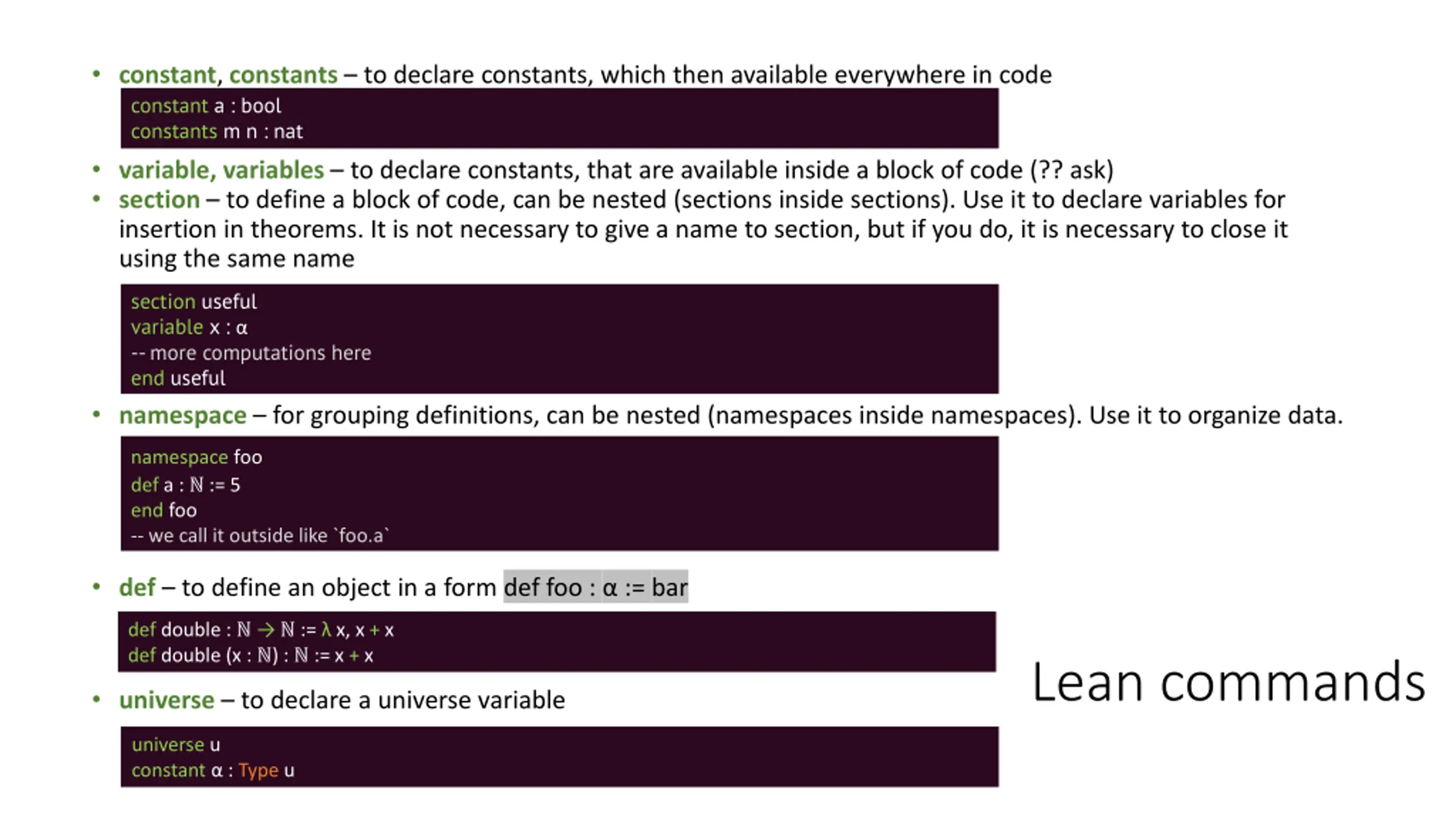 constant, constants to declare constants, which then available everywhere in code constant a : bool constants m n : nat variable, variables to declare constants, that are available inside a block of code (?? ask) section to define a block of code, can be nested (sections inside sections). Use it to declare variables for insertion in theorems. It is not necessary to give a name to section, but if you do, it is necessary to close it using the same name section useful variable x : --more computations here end useful namespace for grouping definitions, can be nested (namespaces inside namespaces). Use it to organize data. namespace foo def a : := 5 end foo -- we call it outside like `foo.a` def to define an object in a form def foo : := bar namespace foo def a : := 5 end foo -- we call it outside like `foo.a` def double : := x, x + x def double (x : ) : := x + x Lean commands universe to declare a universe variable universe u constant : Type u
