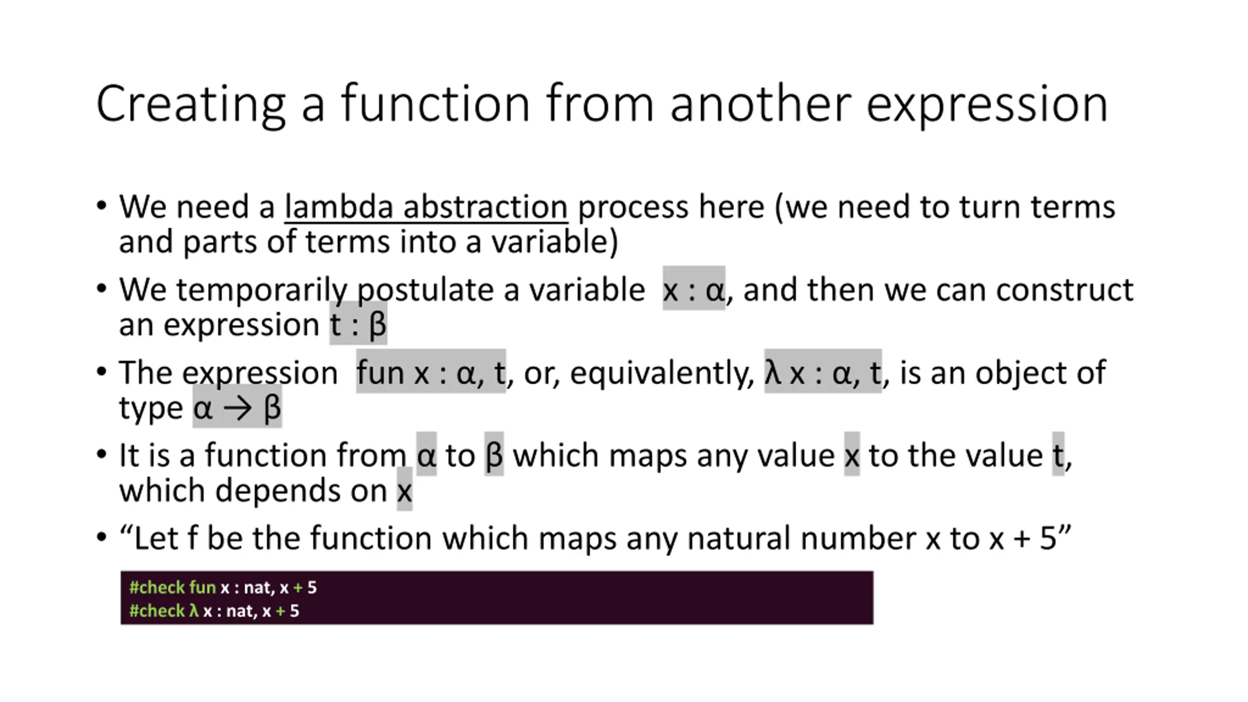 Creating a function from another expression We need a lambda abstraction process here (we need to turn terms and parts of terms into a variable) We temporarily postulate a variable x : , and then we can construct an expression t : The expression fun x : , t, or, equivalently, x : , t, is an object of type It is a function from to which maps any value x to the value t, which depends on x Let f be the function which maps any natural number x to x + 5 #check fun x : nat, x + 5 #check x : nat, x + 5