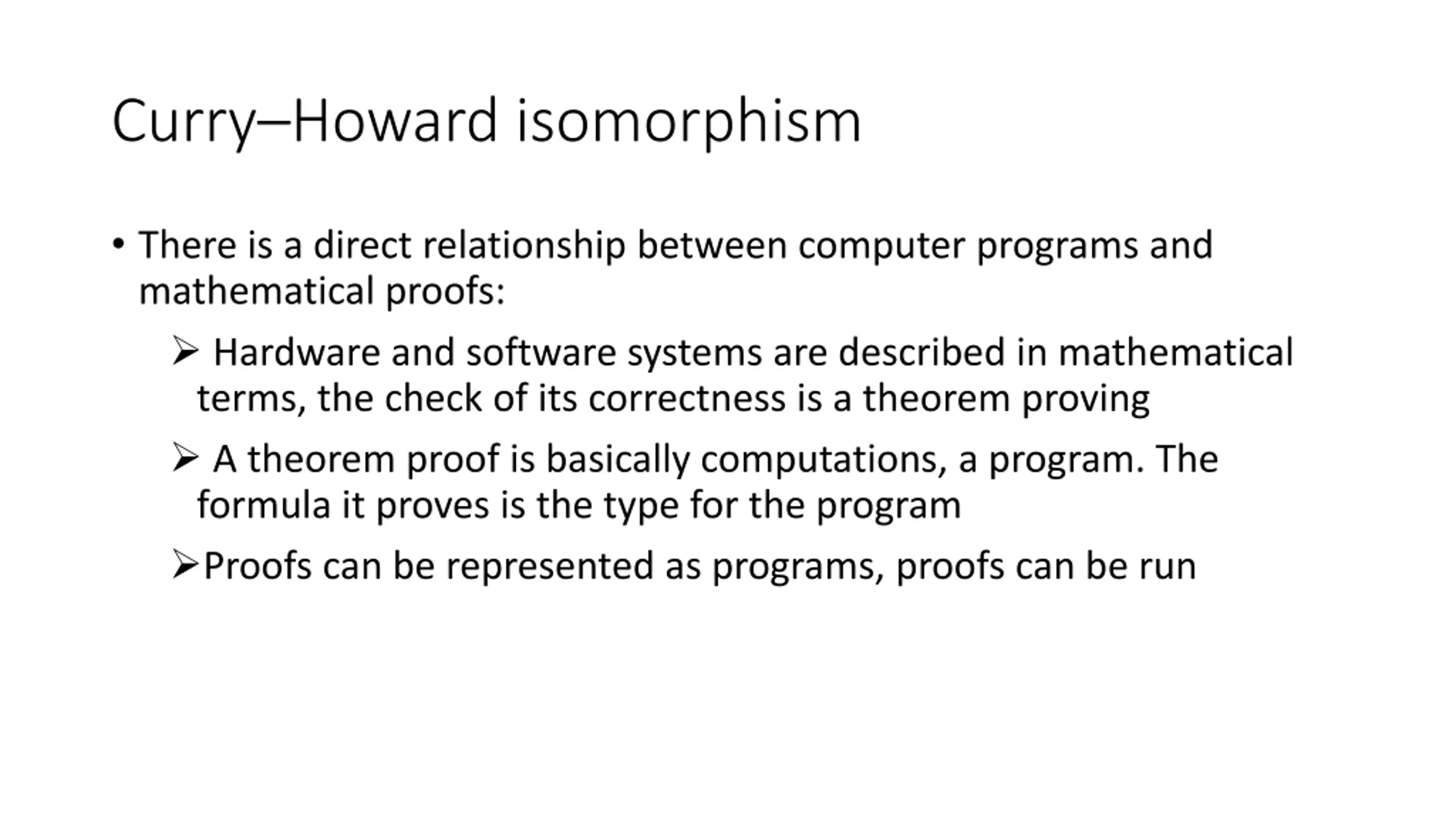 CurryHoward isomorphism There is a direct relationship between computer programs and mathematical proofs: Hardware and software systems are described in mathematical terms, the check of its correctness is a theorem proving A theorem proof is basically computations, a program. The formula it proves is the type for the program Proofs can be represented as programs, proofs can be run