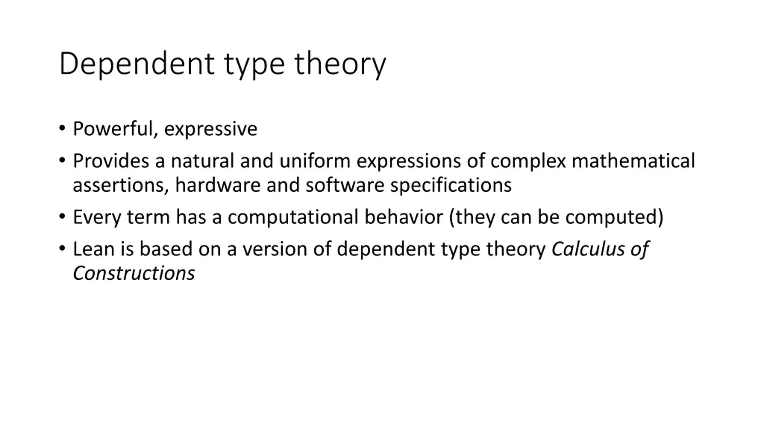 Dependent type theory Powerful, expressive Provides a natural and uniform expressions of complex mathematical assertions, hardware and software specifications Every term has a computational behavior (they can be computed) Lean is based on a version of dependent type theory Calculus of Constructions