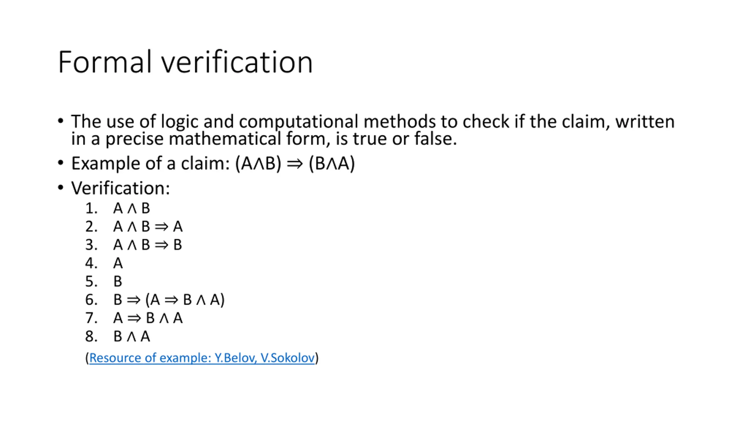 Formal verification The use of logic and computational methods to check if the claim, written in a precise mathematical form, is true or false. Example of a claim: (A B) (B A) Verification: 1. A B 2. A B A 3. A B B 4. A 5. B 6. B (A B A) 7. A B A 8. B A (Resource of example: Y.Belov, V.Sokolov)