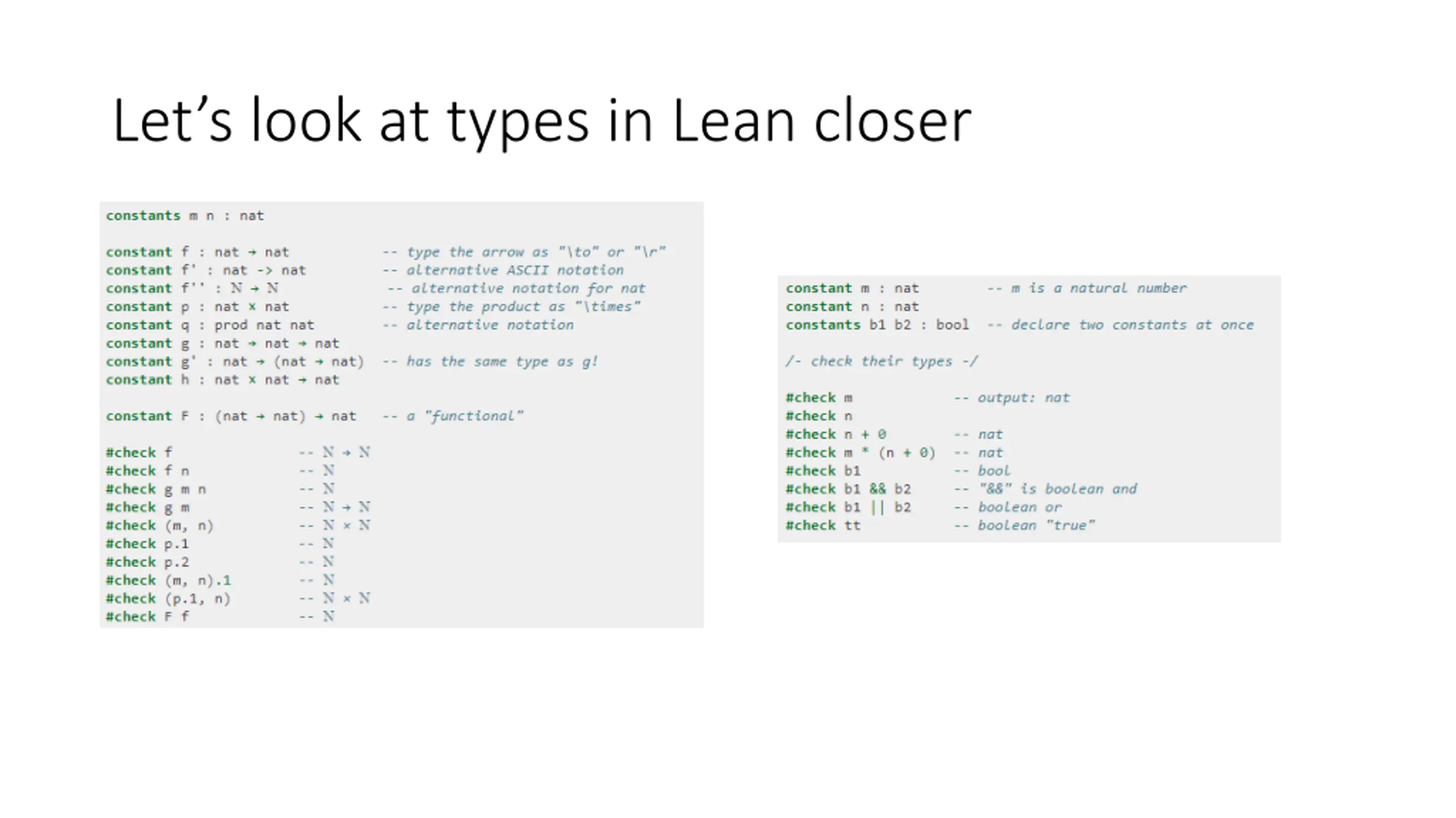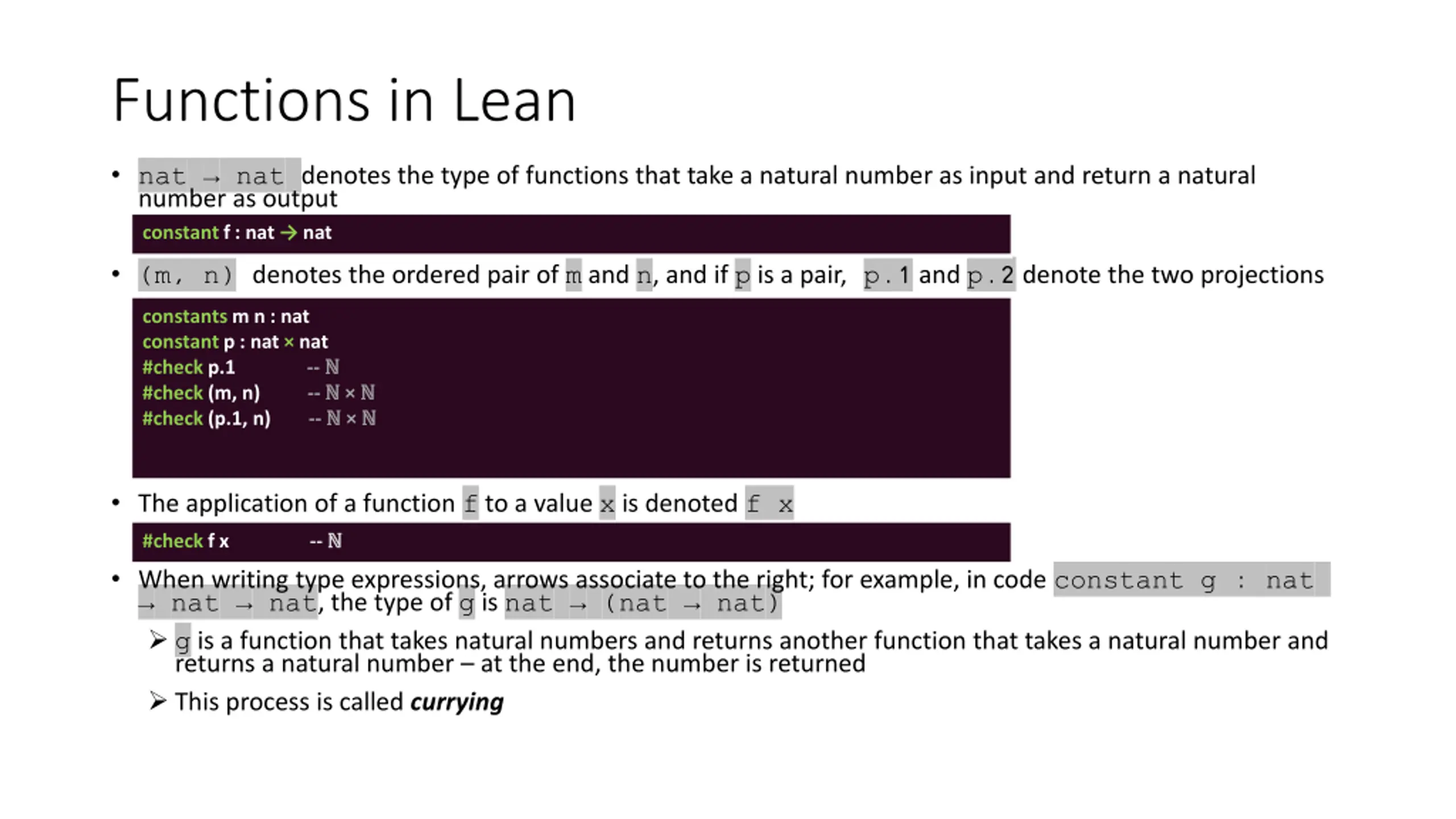 Functions in Lean nat nat denotes the type of functions that take a natural number as input and return a natural number as output constant f : nat nat (m, n) denotes the ordered pair of m and n, and if p is a pair, p.1 and p.2 denote the two projections constants m n : nat constant p : nat nat #check p.1 -- #check (m, n) -- #check (p.1, n) -- The application of a function f to a value x is denoted f x #check f x -- When writing type expressions, arrows associate to the right; for example, in code constant g : nat nat nat, the type of g is nat (nat nat) g is a function that takes natural numbers and returns another function that takes a natural number and returns a natural number at the end, the number is returned This process is called currying constant f : nat nat constants m n : nat constantp : nat nat #check p.1 -- #check (m, n) -- #check (p.1, n) -- #check f x --