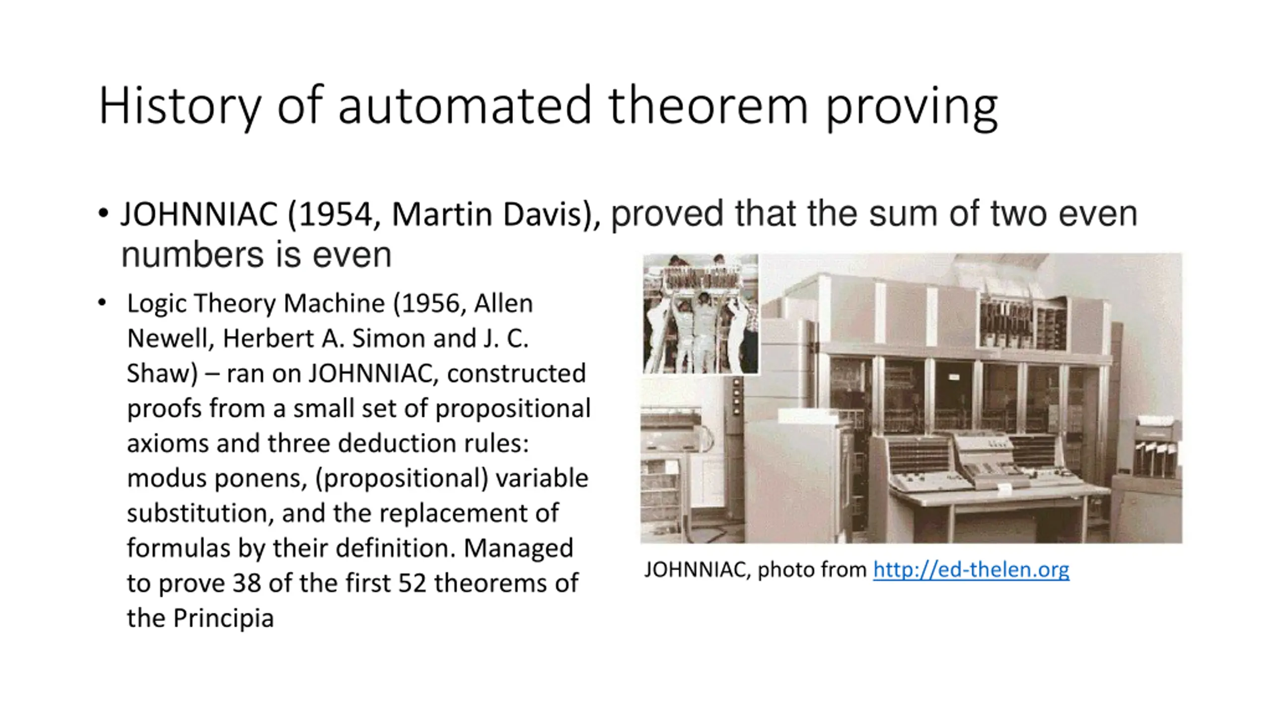 History of automated theorem proving JOHNNIAC (1954, Martin Davis), proved that the sum of two even numbers is even Logic Theory Machine (1956, Allen Newell, Herbert A. Simon and J. C. Shaw) ran on JOHNNIAC, constructed proofs from a small set of propositional axioms and three deduction rules: modus ponens, (propositional) variable substitution, and the replacement of formulas by their definition. Managed to prove 38 of the first 52 theorems of the Principia JOHNNIAC, photo from http://ed-thelen.org