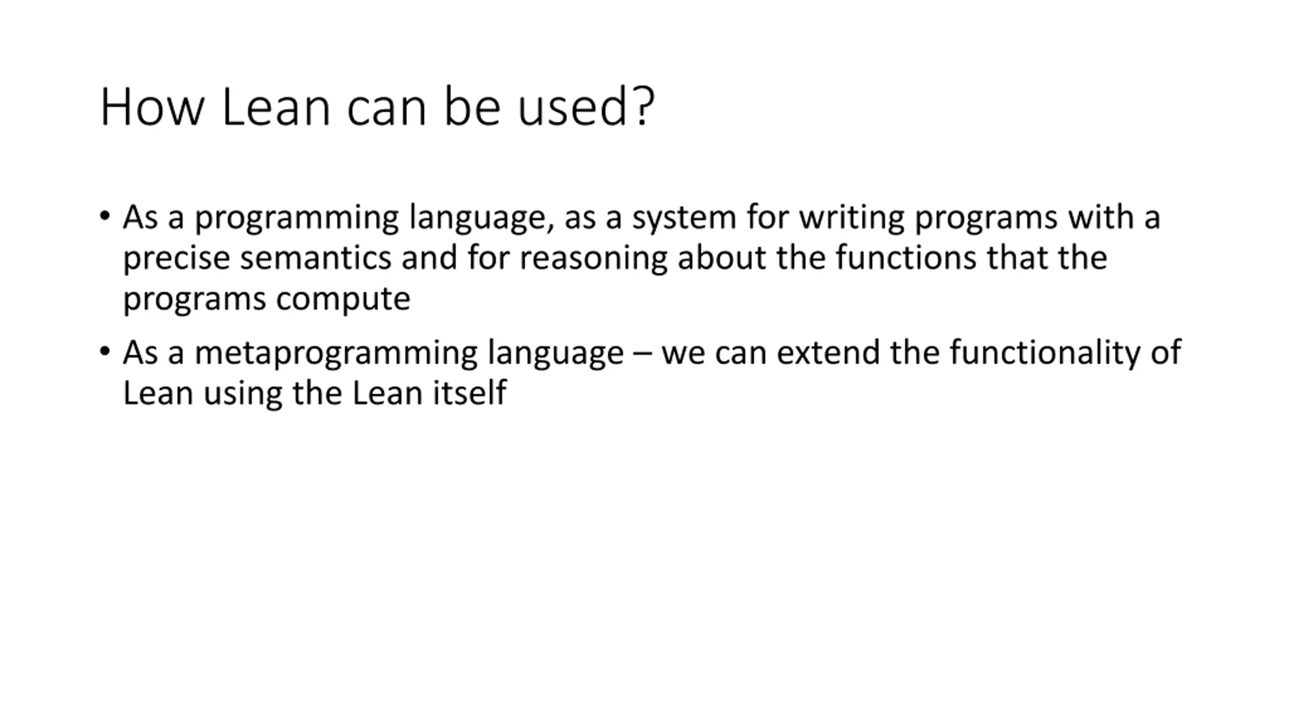 How Lean can be used? As a programming language, as a system for writing programs with a precise semantics and for reasoning about the functions that the programs compute As a metaprogramming language we can extend the functionality of Lean using the Lean itself