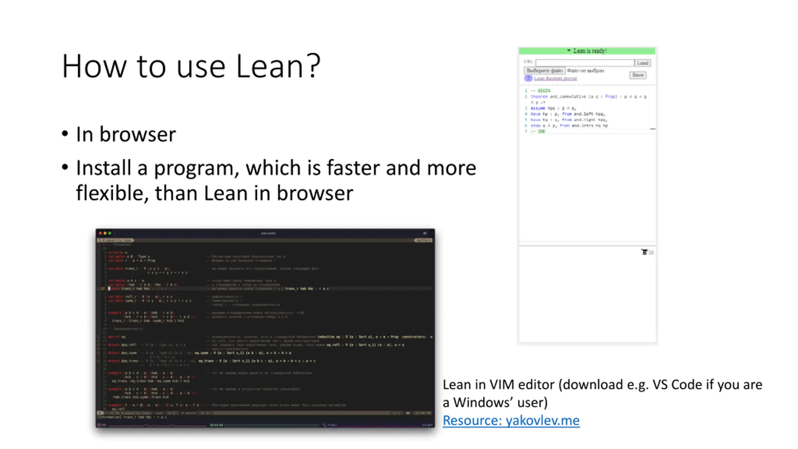 How to use Lean? In browser Install a program, which is faster and more flexible, than Lean in browser Lean in VIM editor (download e.g. VS Code if you are a Windows user) Resource: yakovlev.me