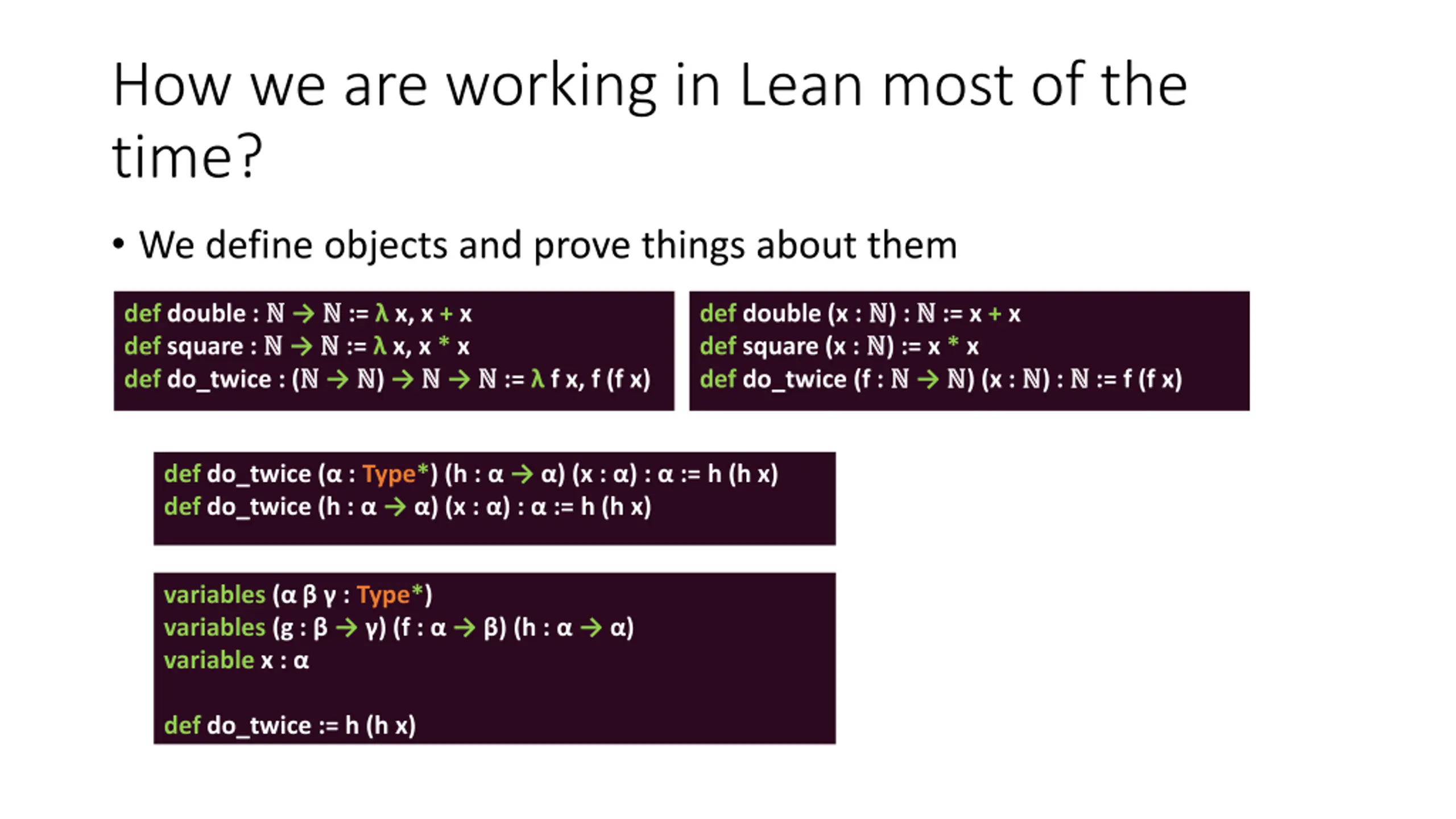 How we are working in Lean most of the time? We define objects and prove things about them def double : := x, x + x def square : := x, x * x def do_twice : ( ) := f x, f (f x) def double (x : ) : := x + x def square (x : ) := x * x def do_twice (f : ) (x : ) : := f (f x) def do_twice ( : Type*) (h : ) (x : ) : := h (h x) def do_twice (h : ) (x : ) : := h (h x) variables ( : Type*) variables (g : ) (f : ) (h : ) variable x : def do_twice := h (h x)