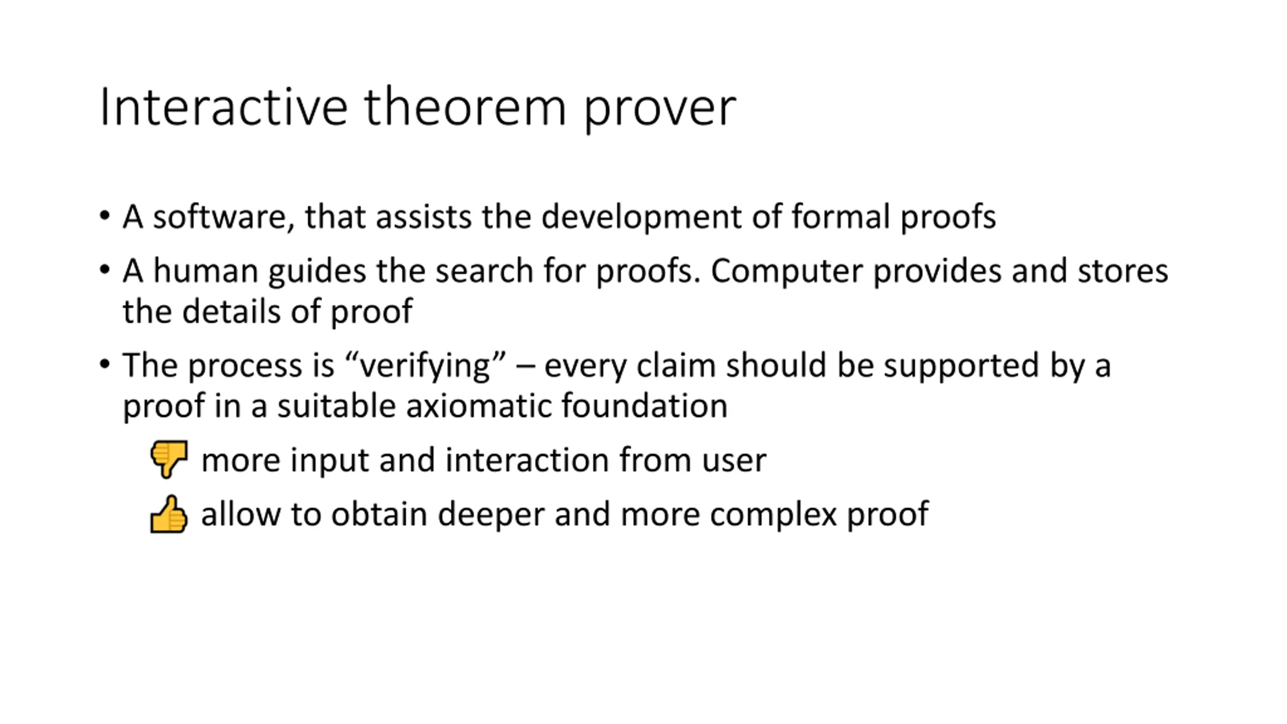 Interactive theorem prover A software, that assists the development of formal proofs A human guides the search for proofs. Computer provides and stores the details of proof The process is verifying every claim should be supported by a proof in a suitable axiomatic foundation more input and interaction from user allow to obtain deeper and more complex proof