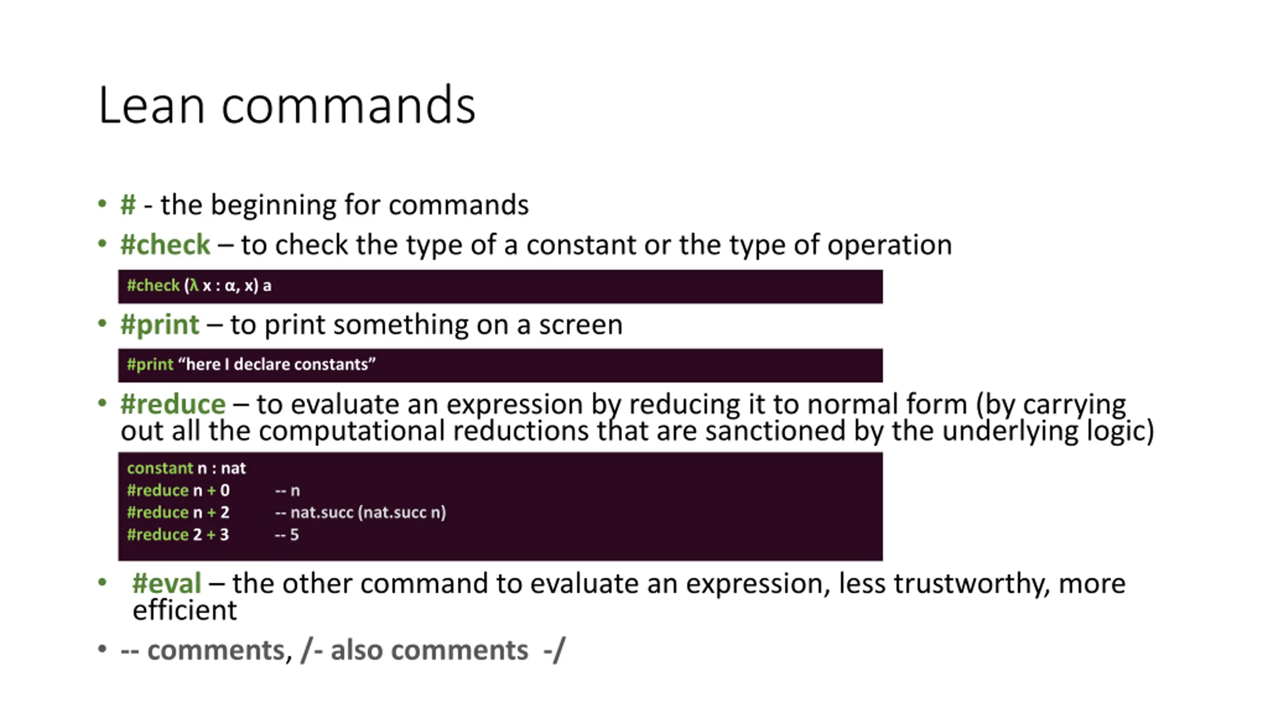 Lean commands # - the beginning for commands #check to check the type of a constant or the type of operation #check ( x : , x) a #print to print something on a screen #print here I declare constants #reduce to evaluate an expression by reducing it to normal form (by carrying out all the computational reductions that are sanctioned by the underlying logic) constant n : nat #reduce n + 0 -- n #reduce n + 2 -- nat.succ (nat.succ n) #reduce 2 + 3 -- 5 #eval the other command to evaluate an expression, less trustworthy, more efficient -- comments, /- also comments -/ #check ( x : , x) a #print here I declare constants constant n : nat #reduce n + 0 -- n #reduce n + 2 -- nat.succ (nat.succ n) #reduce 2 + 3 -- 5