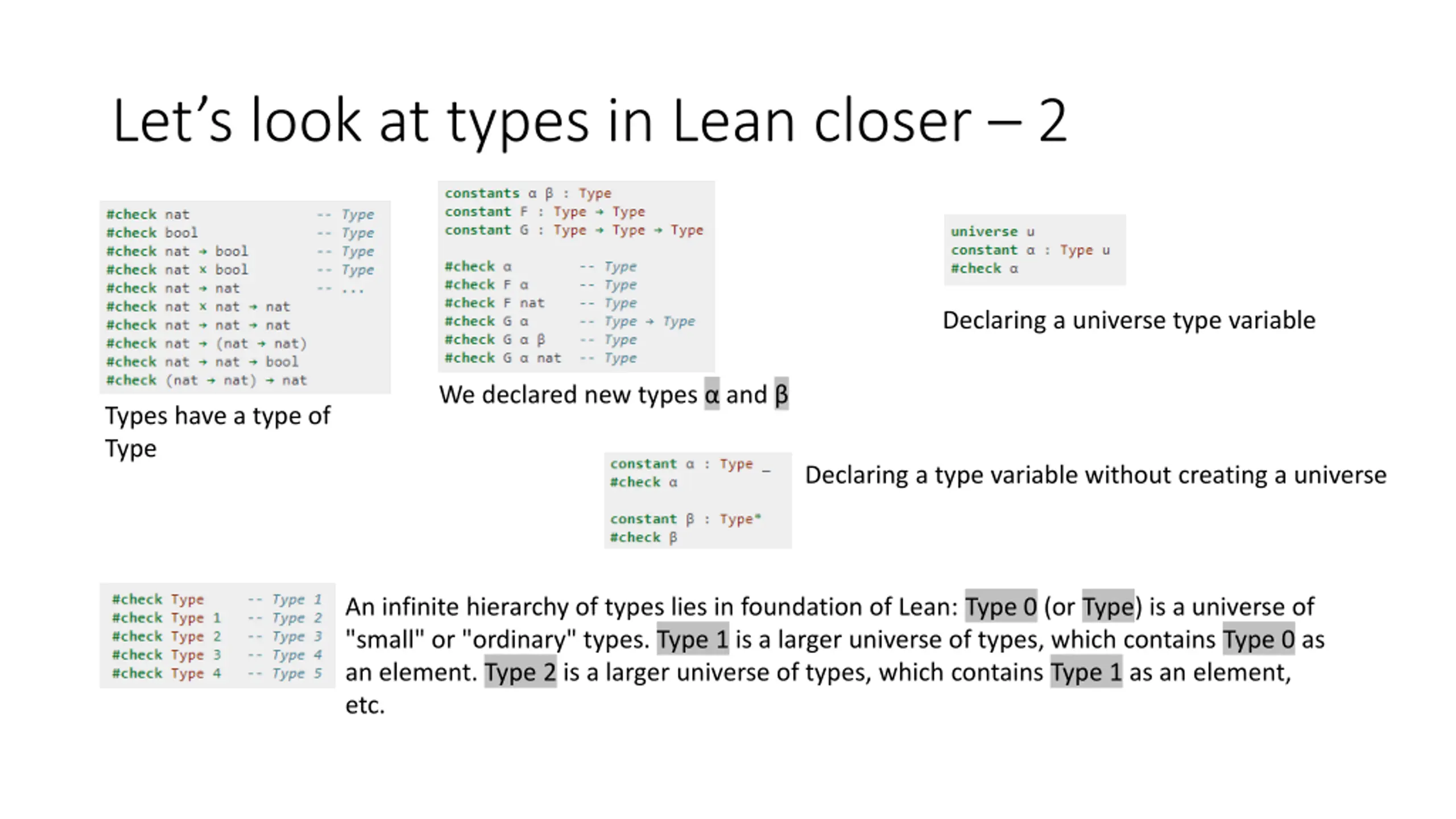 Lets look at types in Lean closer 2 Declaring a universe type variable We declared new types and Types have a type of Type Declaring a type variable without creating a universe An infinite hierarchy of types lies in foundation of Lean: Type 0 (or Type) is a universe of "small" or "ordinary" types. Type 1 is a larger universe of types, which contains Type 0 as an element. Type 2 is a larger universe of types, which contains Type 1 as an element, etc.