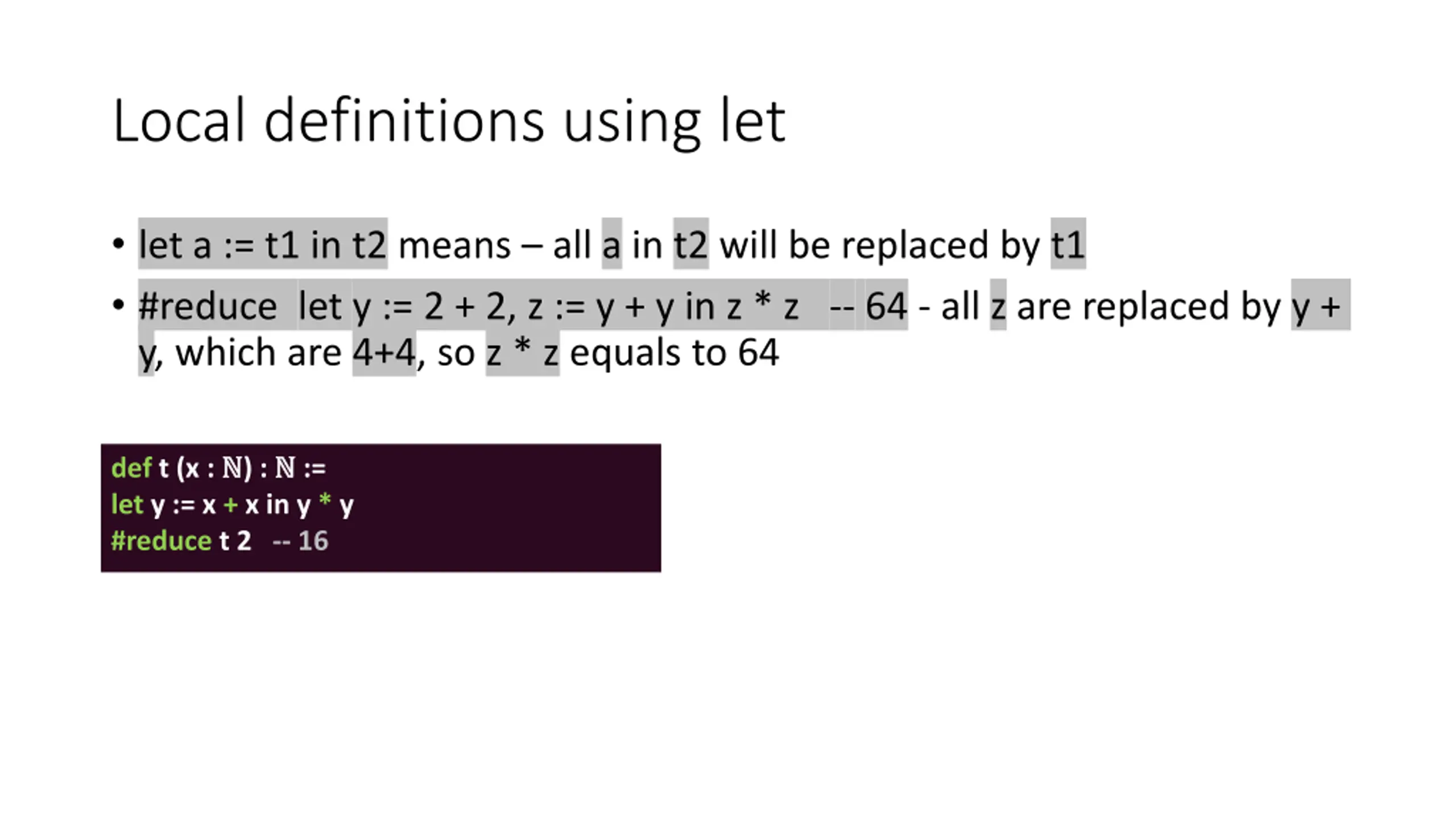Local definitions using let let a := t1 in t2 means all a in t2 will be replaced by t1 #reduce let y := 2 + 2, z := y + y in z * z -- 64 - all z are replaced by y + y, which are 4+4, so z * z equals to 64 def t (x : ) : := let y := x + x in y * y #reduce t 2 -- 16