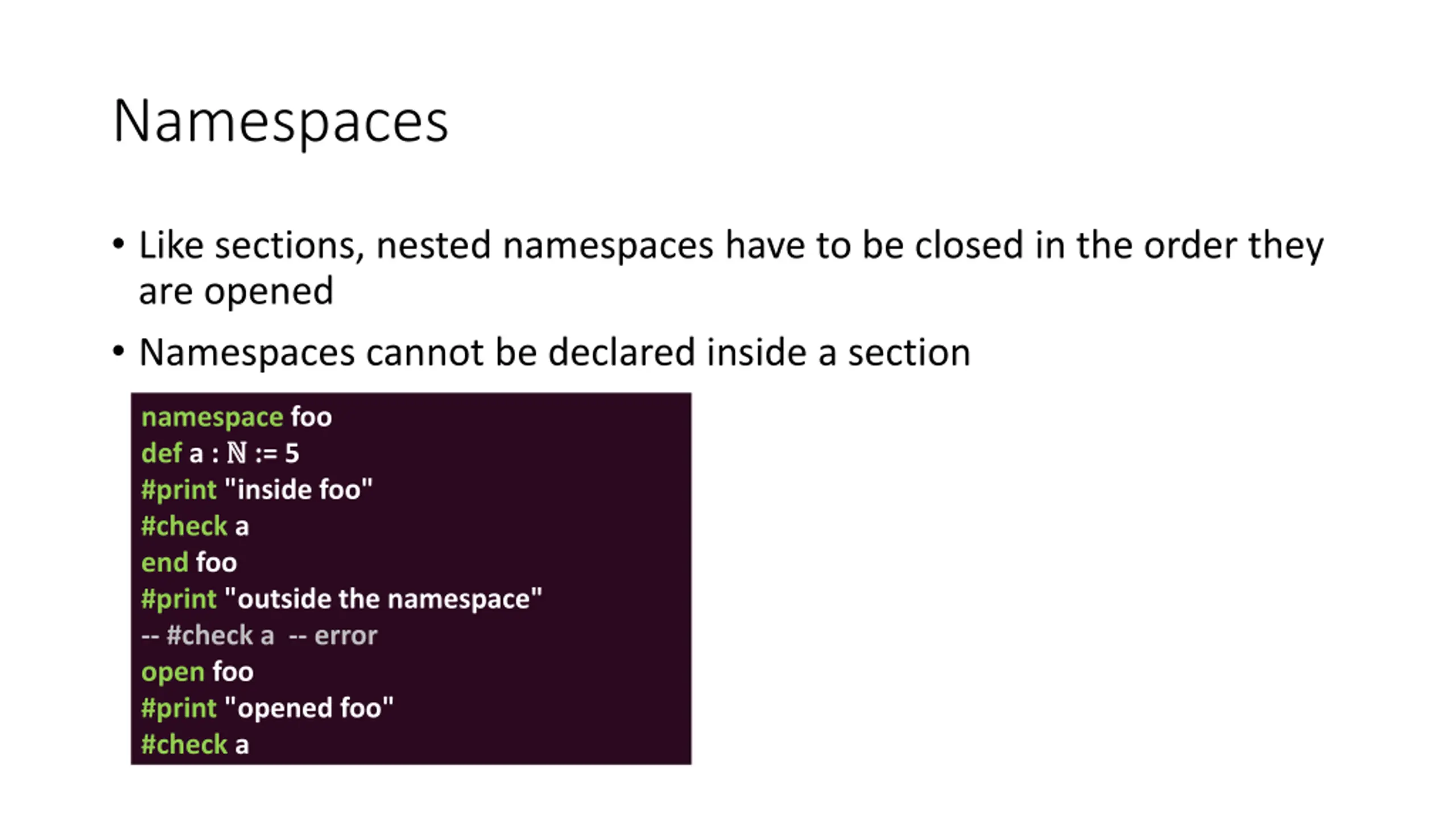 Namespaces Like sections, nested namespaces have to be closed in the order they are opened Namespaces cannot be declared inside a section namespace foo def a : := 5 #print "inside foo" #check a end foo #print "outside the namespace" -- #check a -- error open foo #print "opened foo" #check a