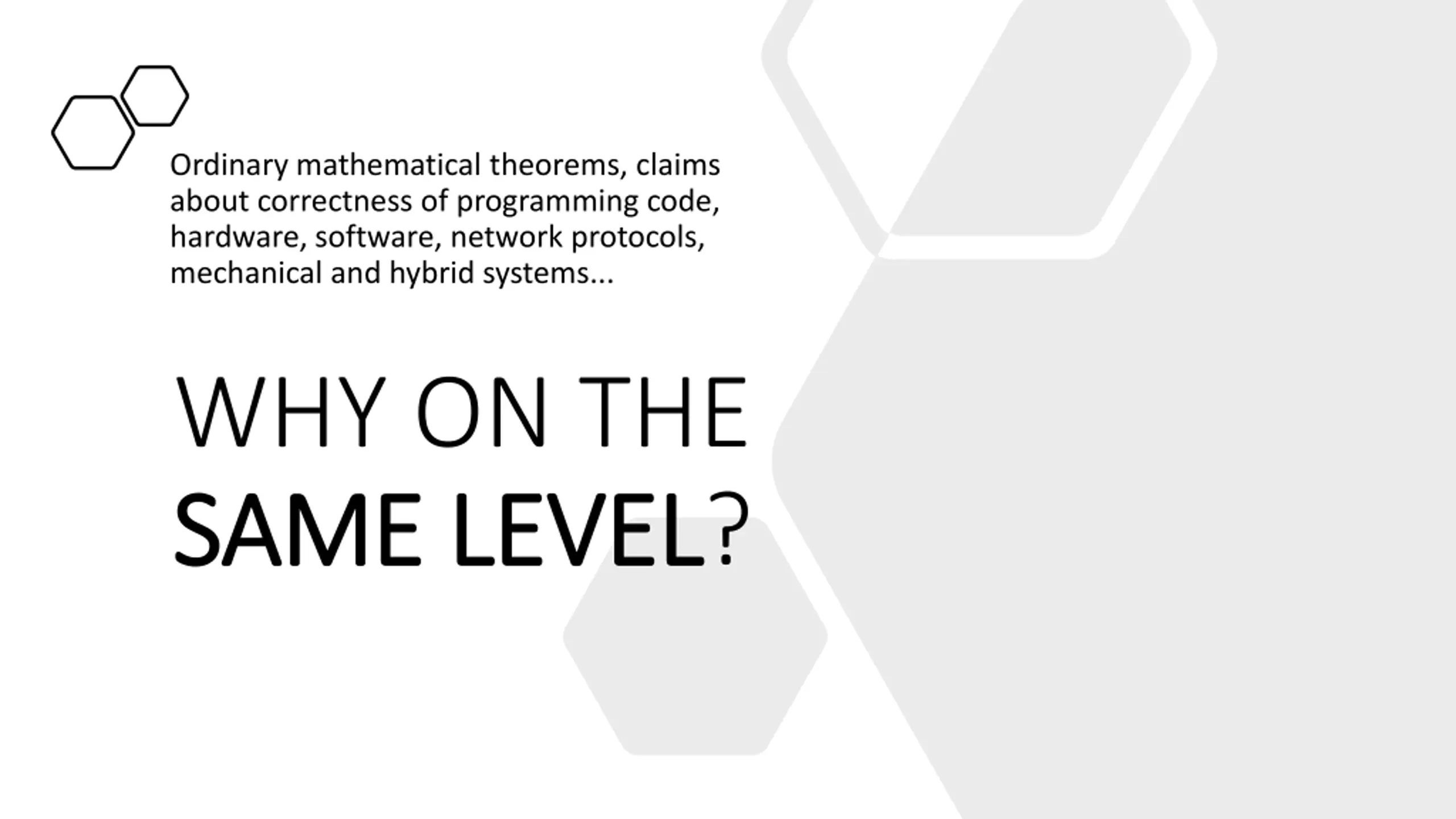 Ordinary mathematical theorems, claims about correctness of programming code, hardware, software, network protocols, mechanical and hybrid systems... WHY ON THE SAME LEVEL SAME LEVEL?