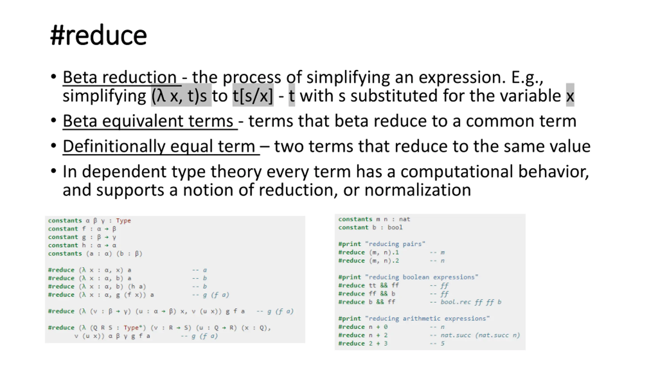 #reduce #reduce Beta reduction - the process of simplifying an expression. E.g., simplifying ( x, t)s to t[s/x] - t with s substituted for the variable x Beta equivalent terms - terms that beta reduce to a common term Definitionally equal term two terms that reduce to the same value In dependent type theory every term has a computational behavior, and supports a notion of reduction, or normalization